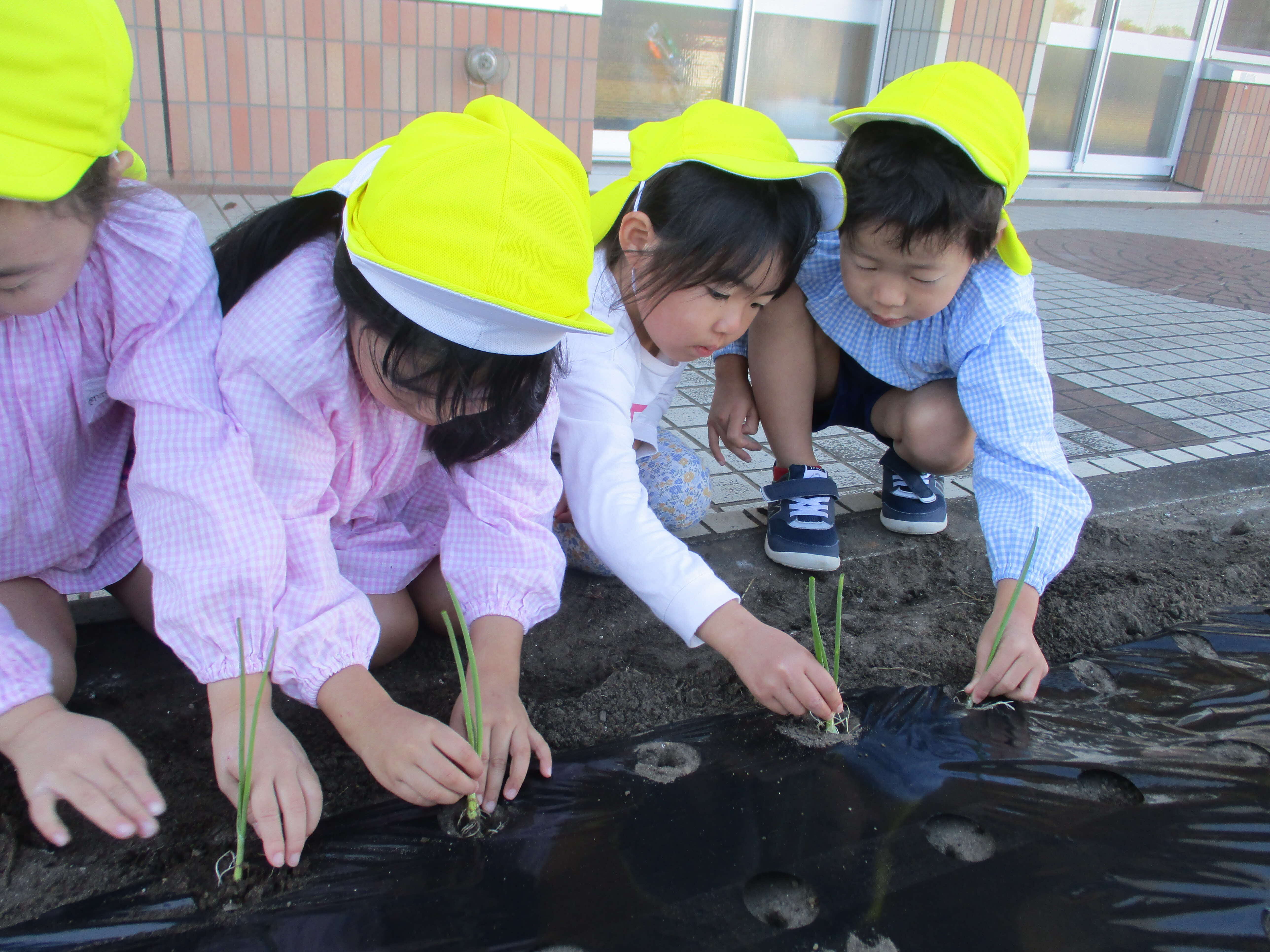 4歳児(すみれ組)がクラス前の畑に玉ねぎの苗を植えました。苗を1本、1本丁寧に植えています。細い苗が、これからどれくらい大きくなるのかな。