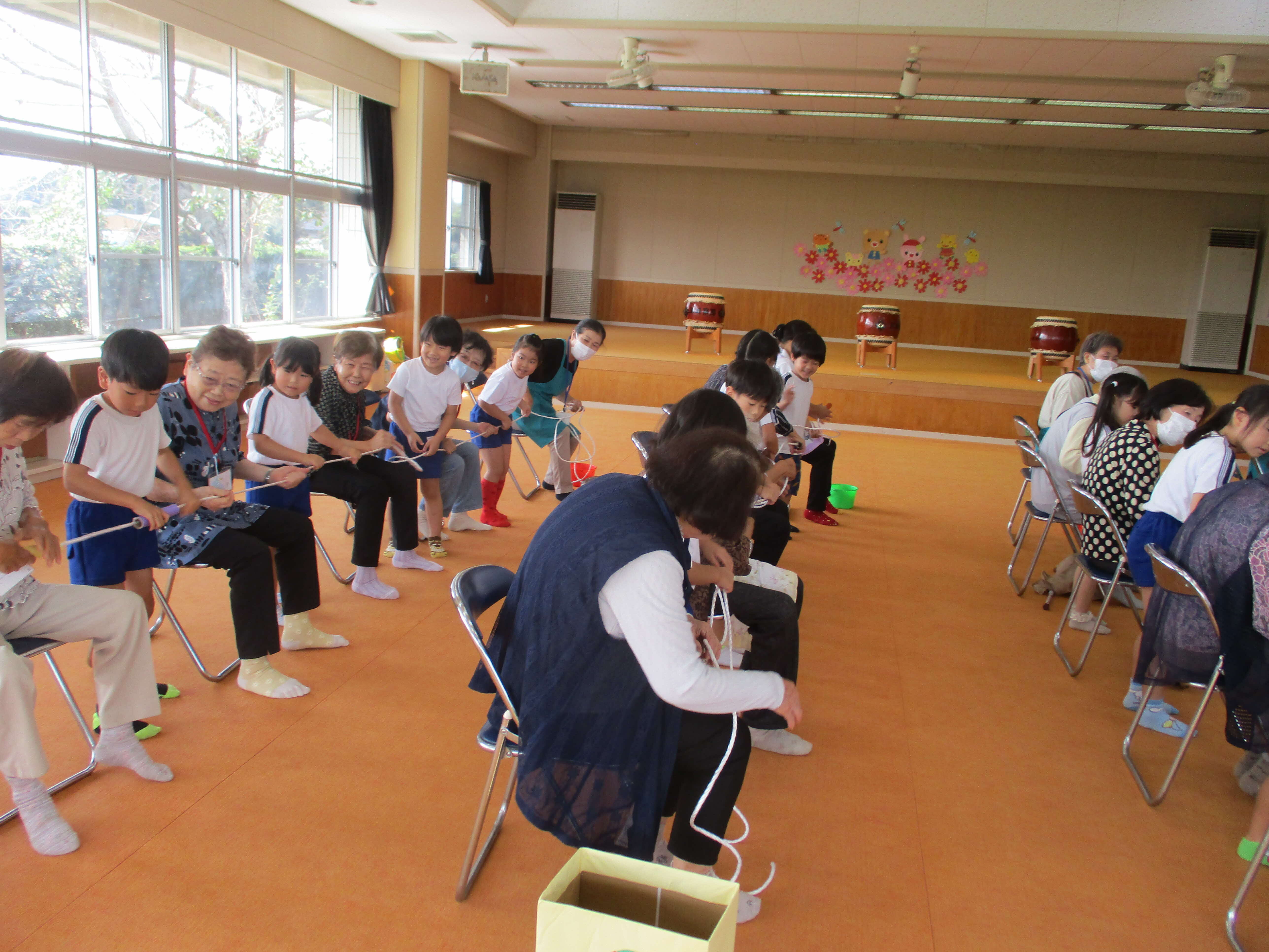 和太鼓を披露したくさんの拍手をもらったり、紐通しゲームで1位を競ったりして、楽しい時間を過ごしました。