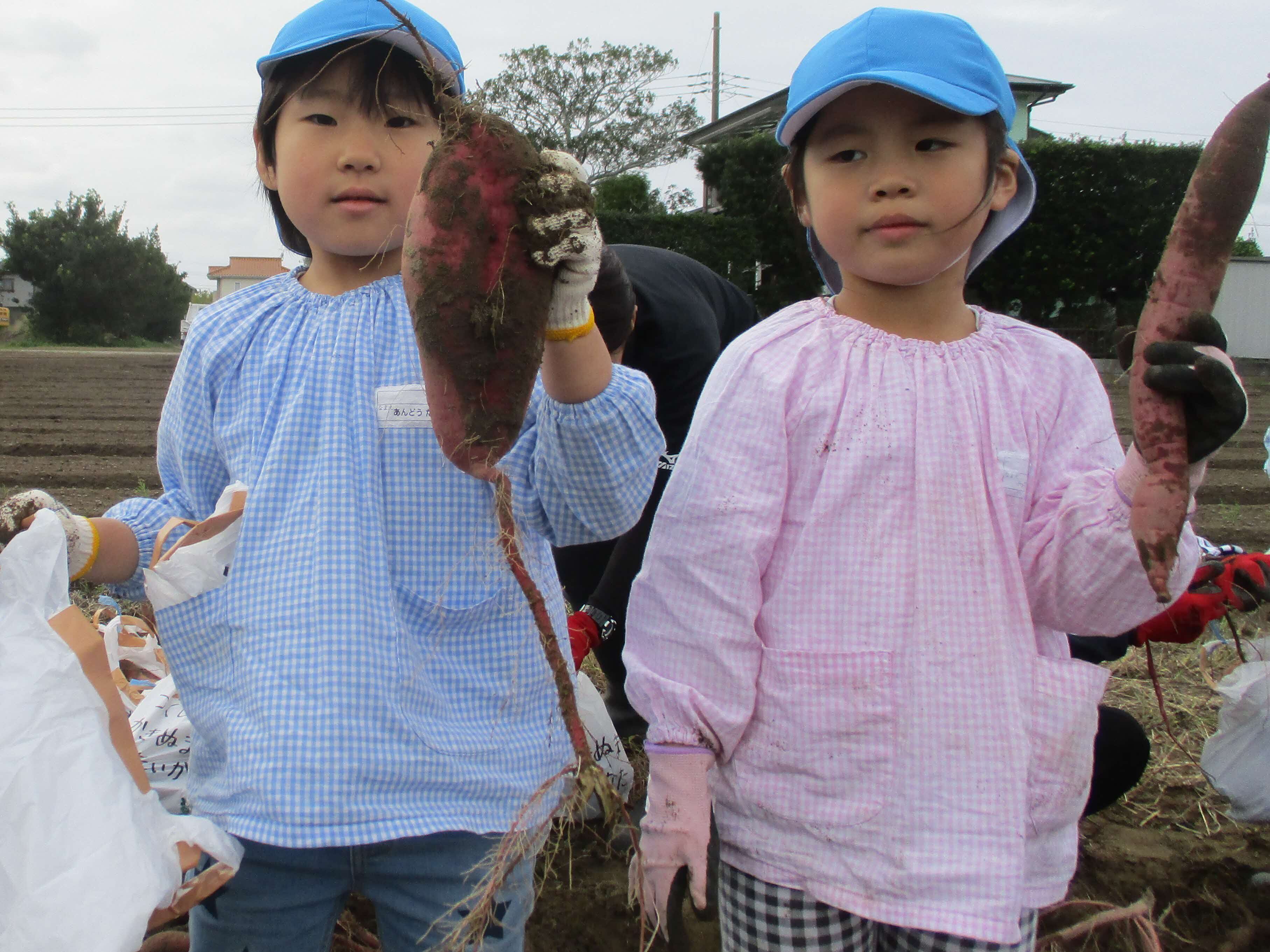 5歳児(ゆり組)と4歳児(すみれ組)が農協青年部のご厚意で5月に植えたさつまいもの収穫体験をしました。