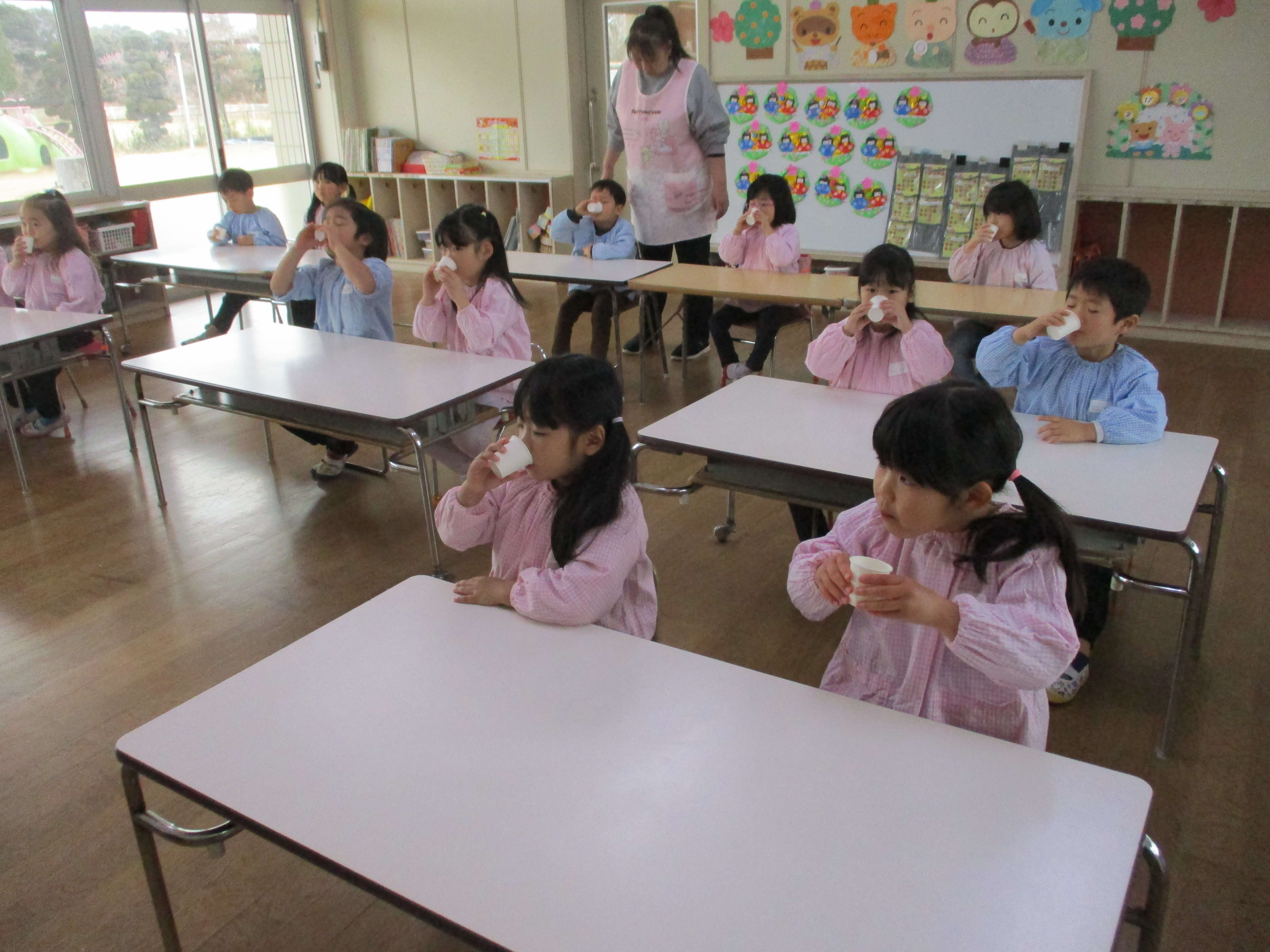 虫歯予防のため4歳児(すみれ組)を対象にフッ化物洗口指導をしました。