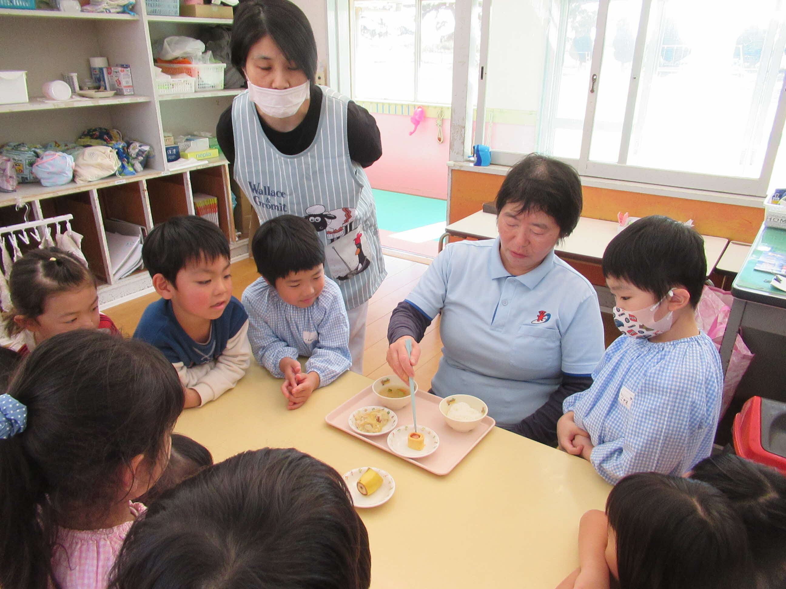 紙芝居後、給食の先生が食事の挨拶やマナーについて、クイズ形式で教えてもらいました。刺し箸、迷い箸、寄せ箸、立て箸など、紙芝居で知ったマナー違反をしっかり見つけることができました。教えたもらったマナーを守り食事を楽しんでいきます。