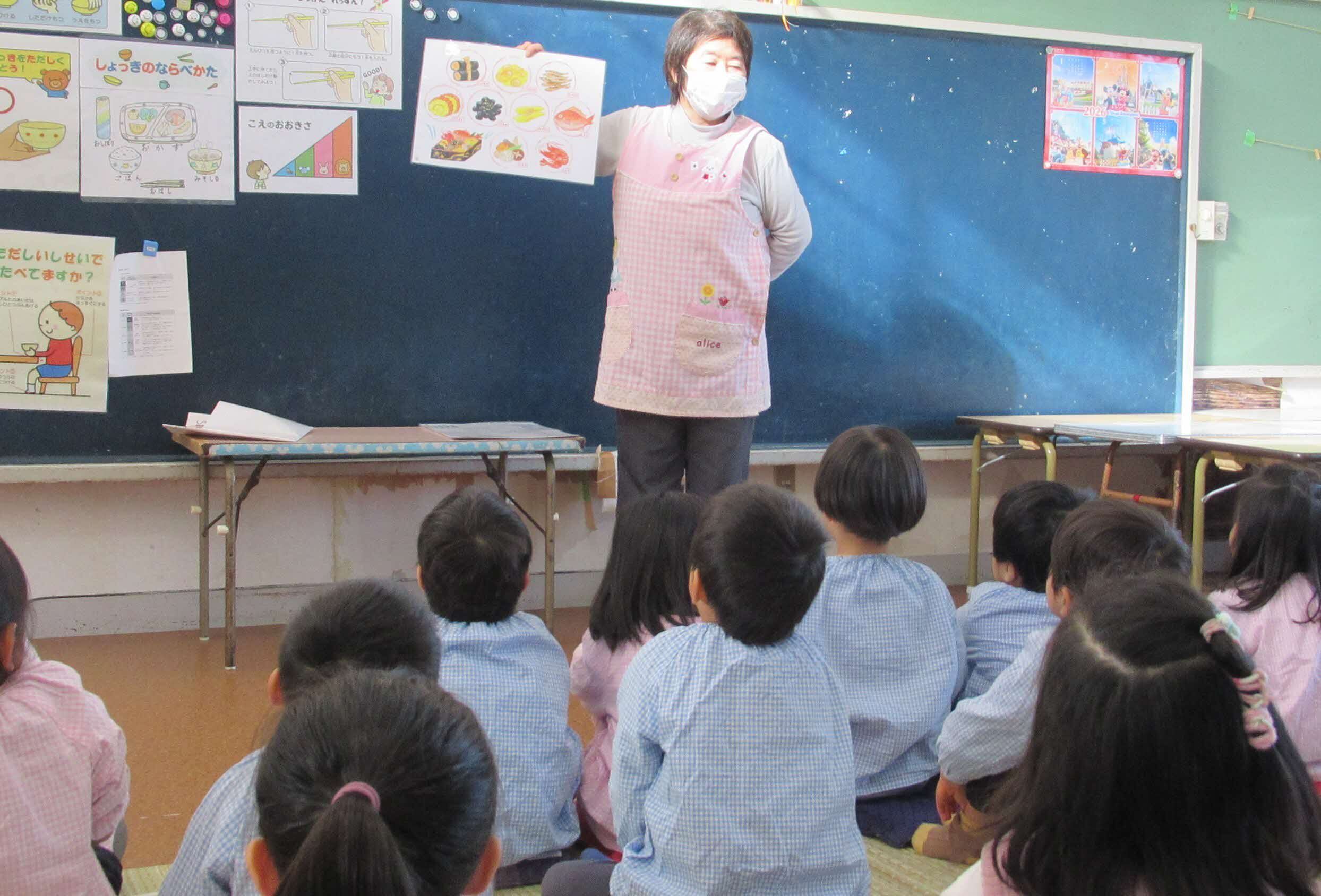 給食の先生に正月料理について話をしてもらいました。おせちの絵本を読んだり、おせちについてのクイズで材料ごとに意味が込められていることを知り興味を持って答えていました。