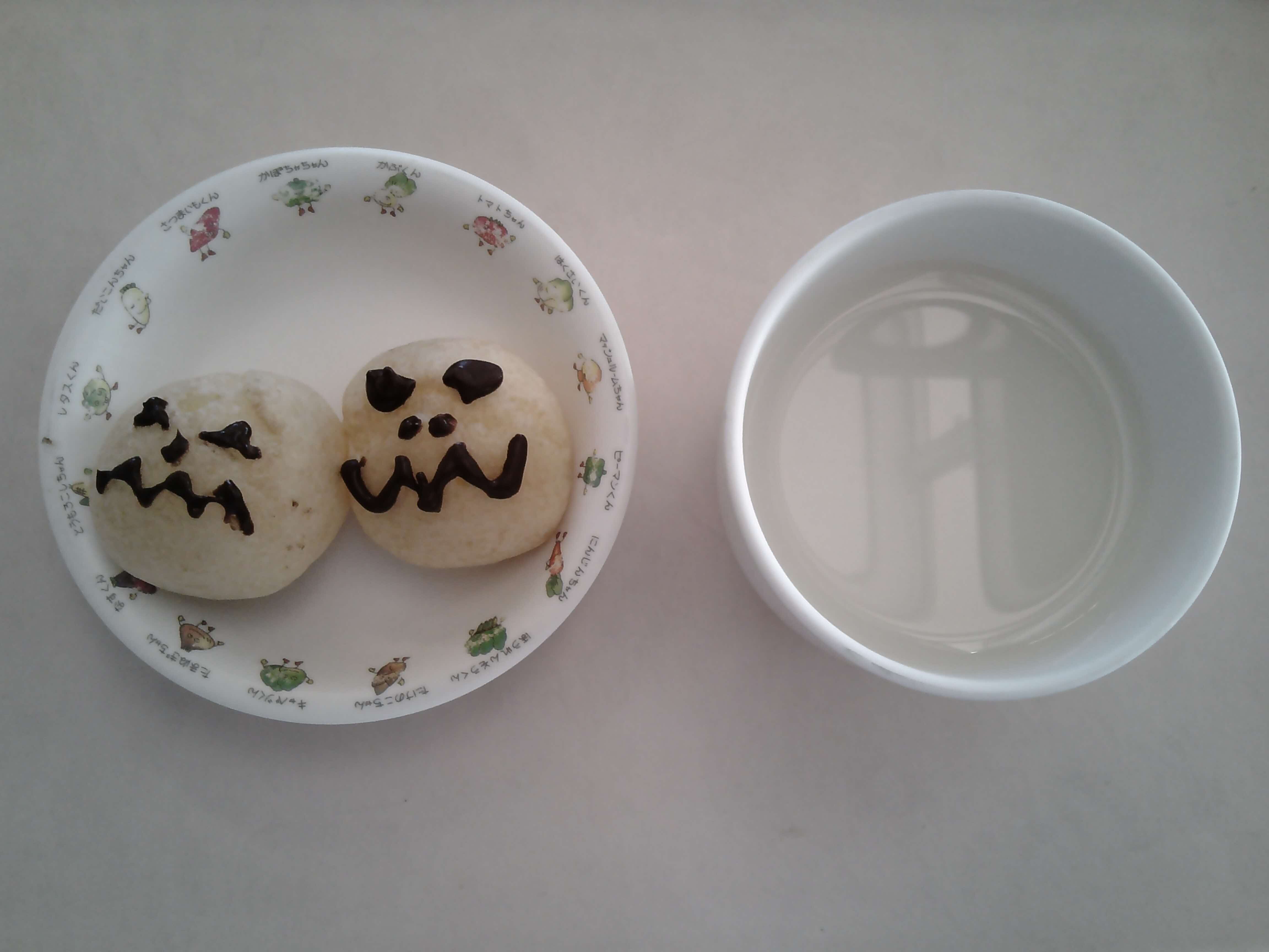 おやつには給食の先生が、プチシュークリーム一つひとつにチョコペンでハロウィンぽい顔を描いて出してくれました。顔が違うシュークリームを見て「お化けだったよ」「ガイコツみたい」「かぼちゃの顔に似てる」と子どもたちは大喜びでした。