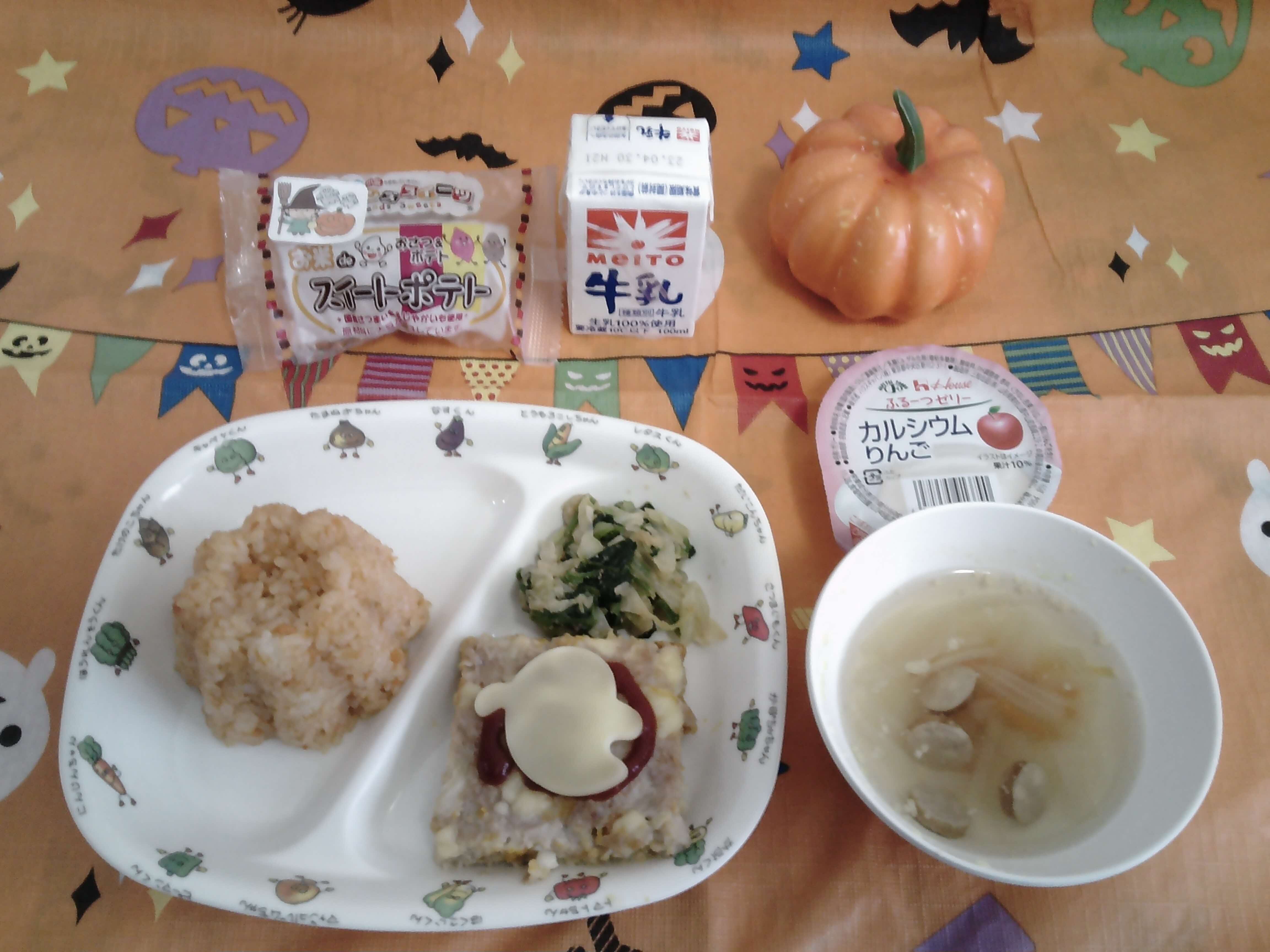 10月31日(金曜日)の給食はハロウィンメニューでした。かぼちゃ型のチキンピラフが盛り付けられ、ハロウィンミートローフにはかわいいお化け型のチーズがのっていました。子どもたちは、給食をみて「ハッピーハロウィン」と友だちと言い合っていました。
