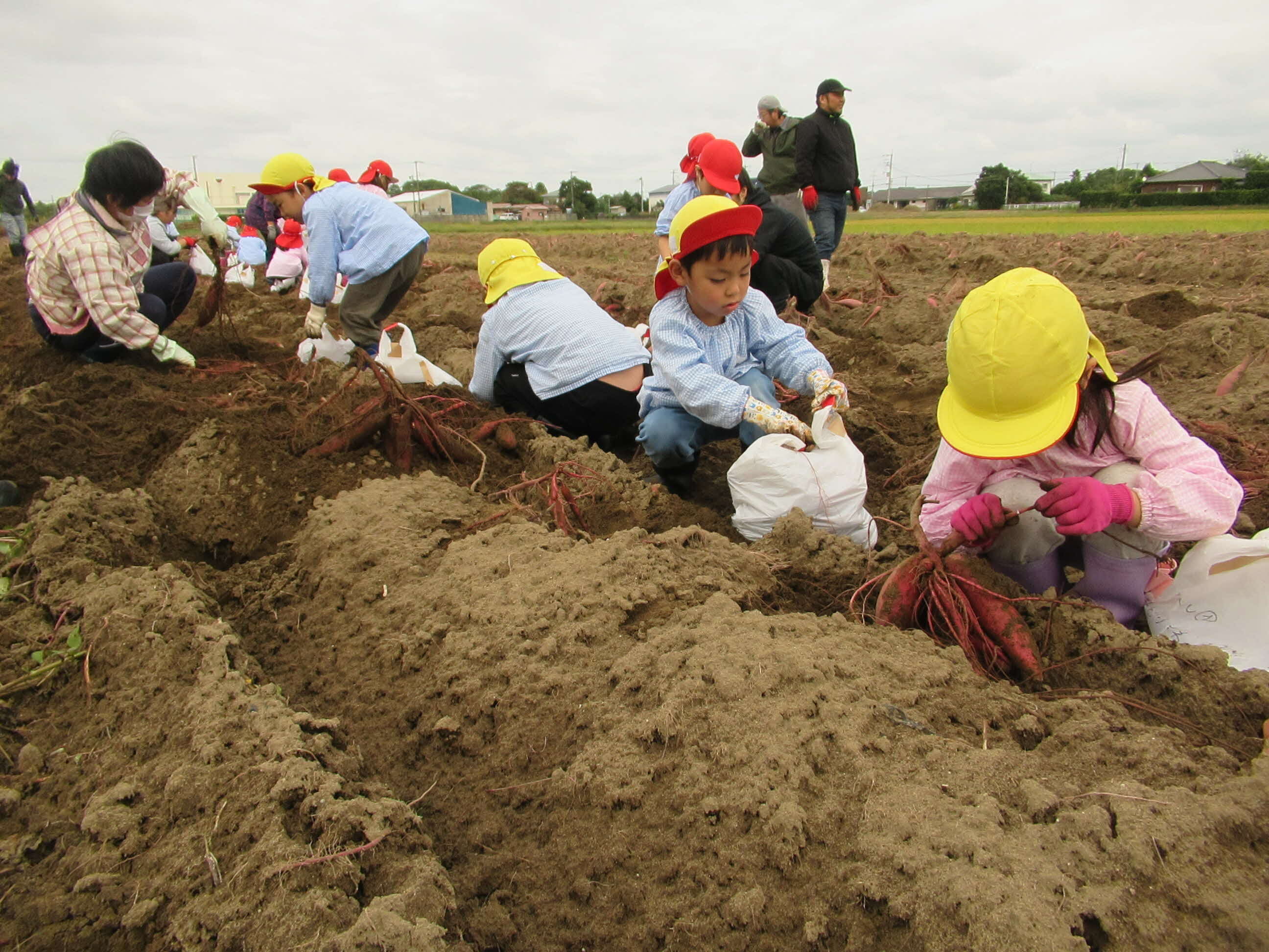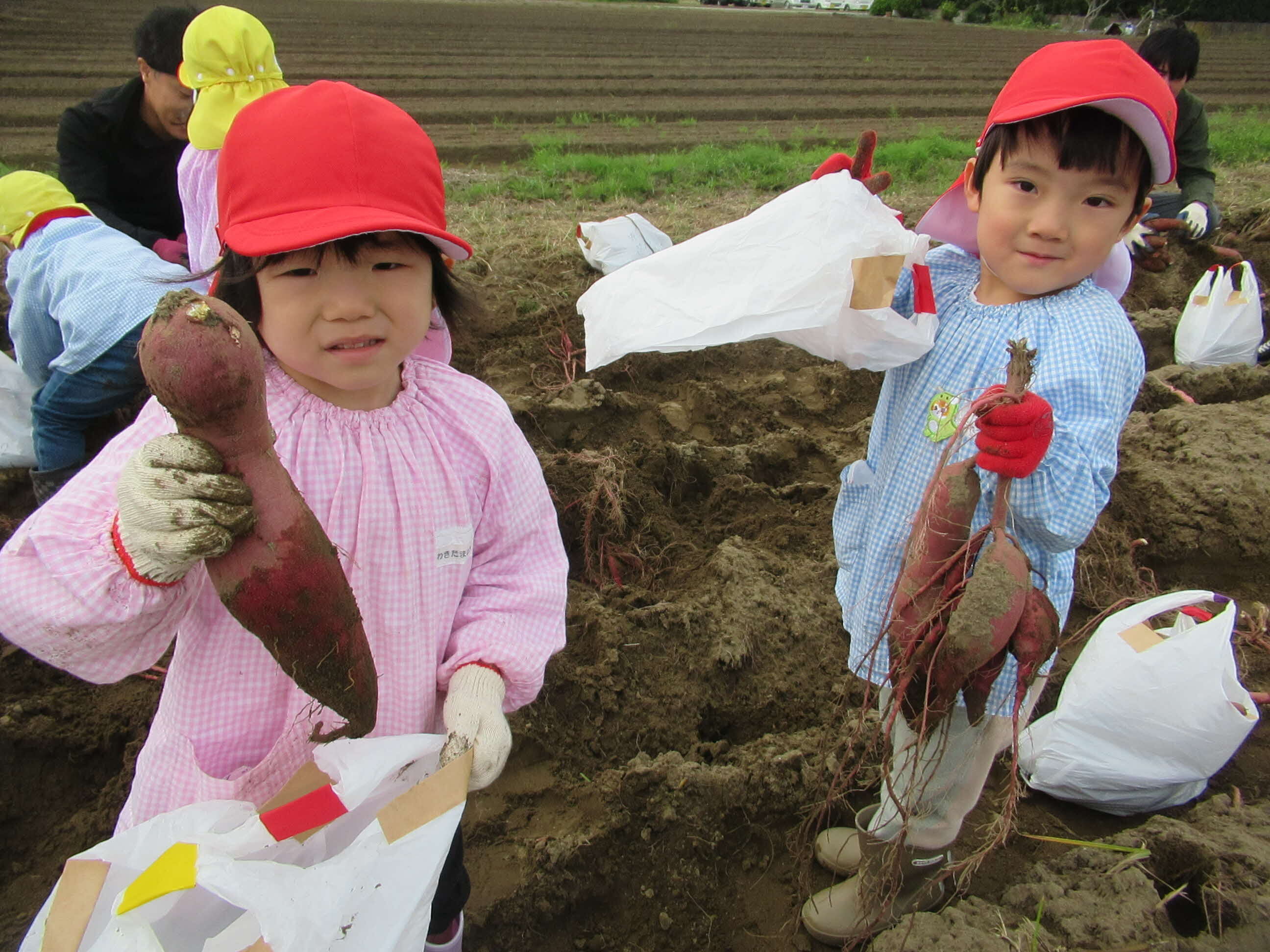 JA青年部のお兄さんたちに手伝ってもらいながら大きい芋をたくさん収穫することができました。友だちと大きさや本数を比べながら芋掘りを楽しみました。