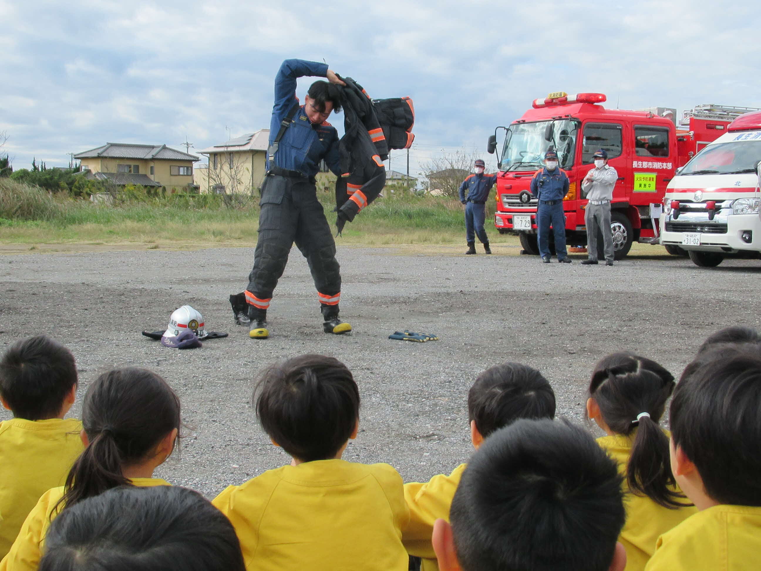 出動時の着替えを見せていただきました。消防士さんから「40秒で着替えができる」と言われ、子どもたちが応援する中36秒で着替えが終わり子どもたちから「かっこいい」「すごい!」と歓声が上がっていました。