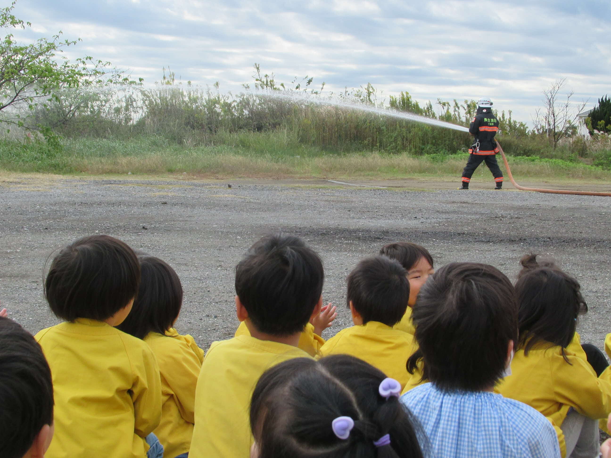 放水する様子も見せていただきました。水が勢いよくホースから出ると拍手が起こりました。かっこいい消防士さんの姿を見て「消防士になりたい」と話す子もいました。