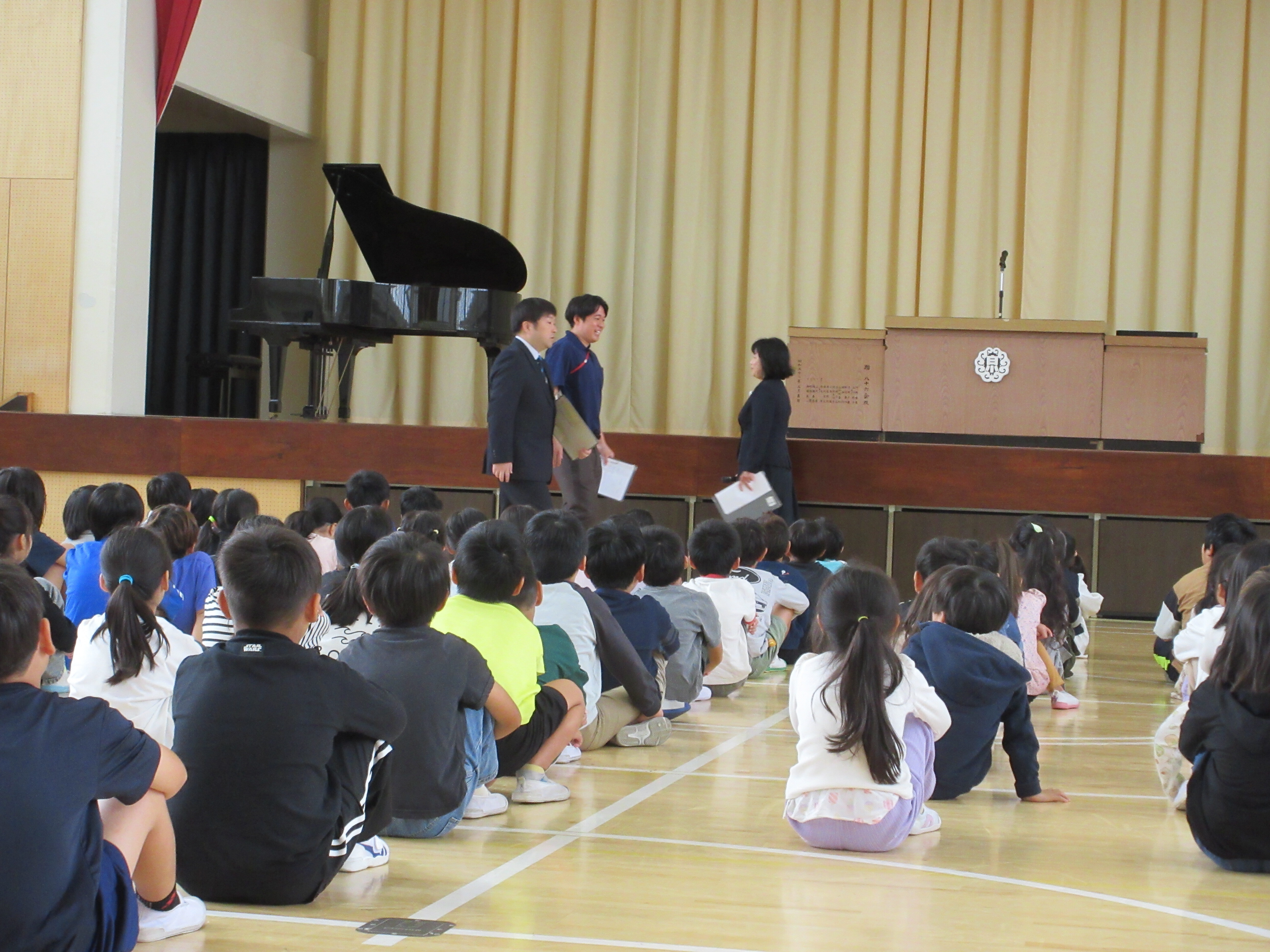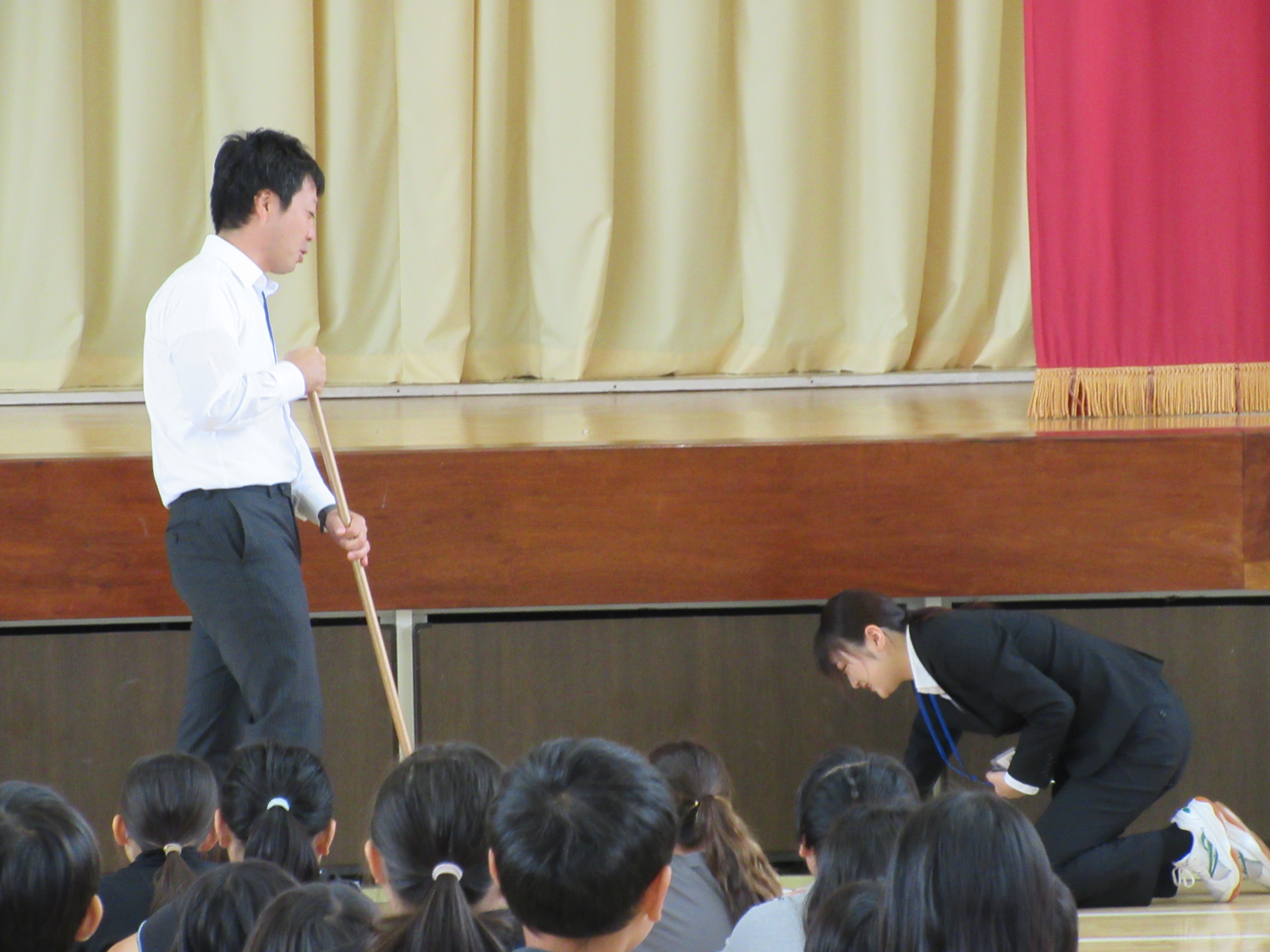 今日から後期が始まりました。子どもたちには、「あいさつ」と「そうじ」について話をしました。今日は、職員に劇をやってもらい、いつもの自分のあいさつやそうじと比べて見たり、どのやり方がいいやり方なのかを考えたりしました。今日からあいさつやそうじについて、全校児童で意識して取り組んでいきます。