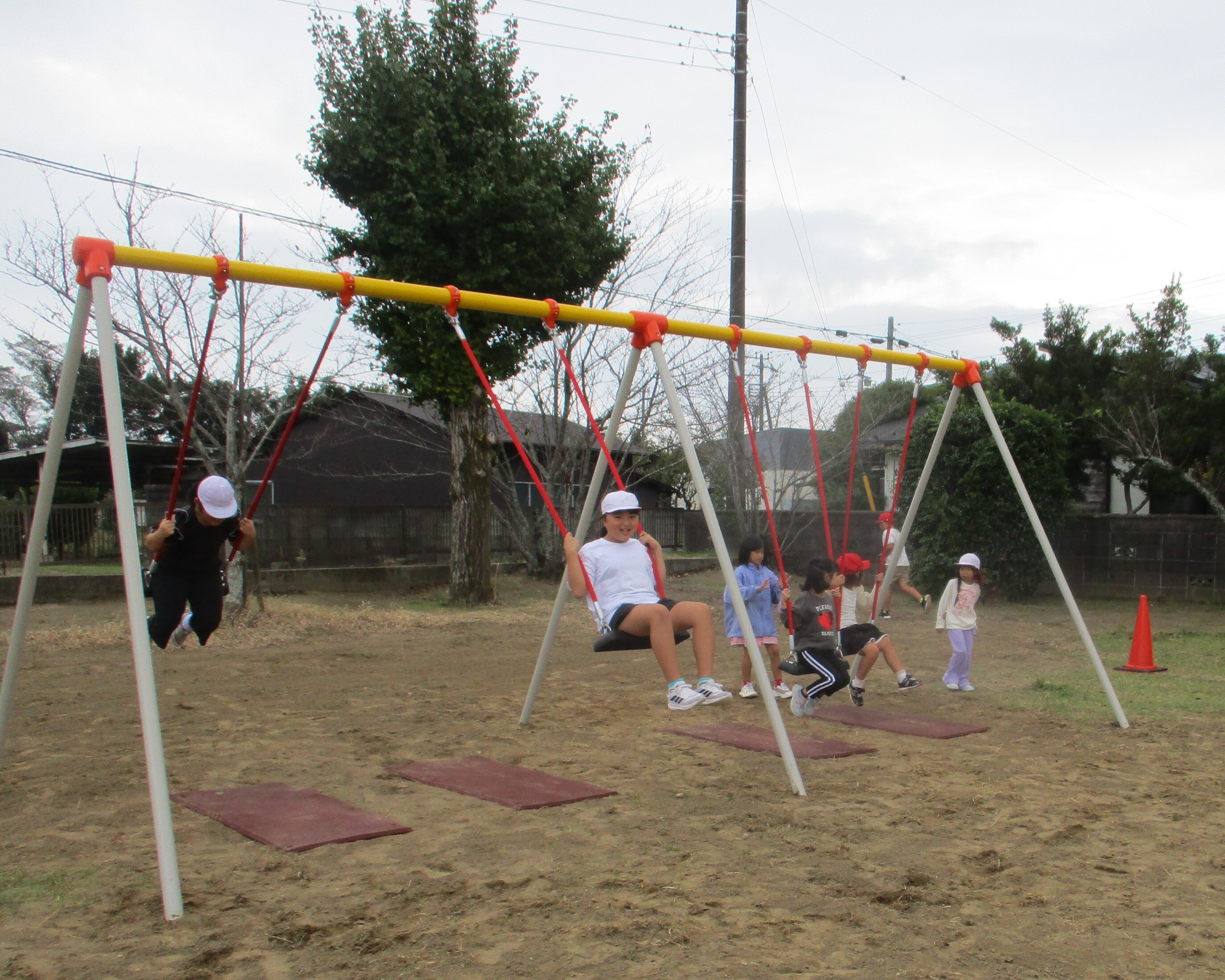 安全を考慮して古いブランコが撤去され、しばらく使えなかったブランコ。新しいブランコが設置され、子どもたちは大喜びです。工事をしてくださった皆さんに、全校児童で「ありがとうございます」と感謝の気持ちを伝えました。安全第一で大切に使います。