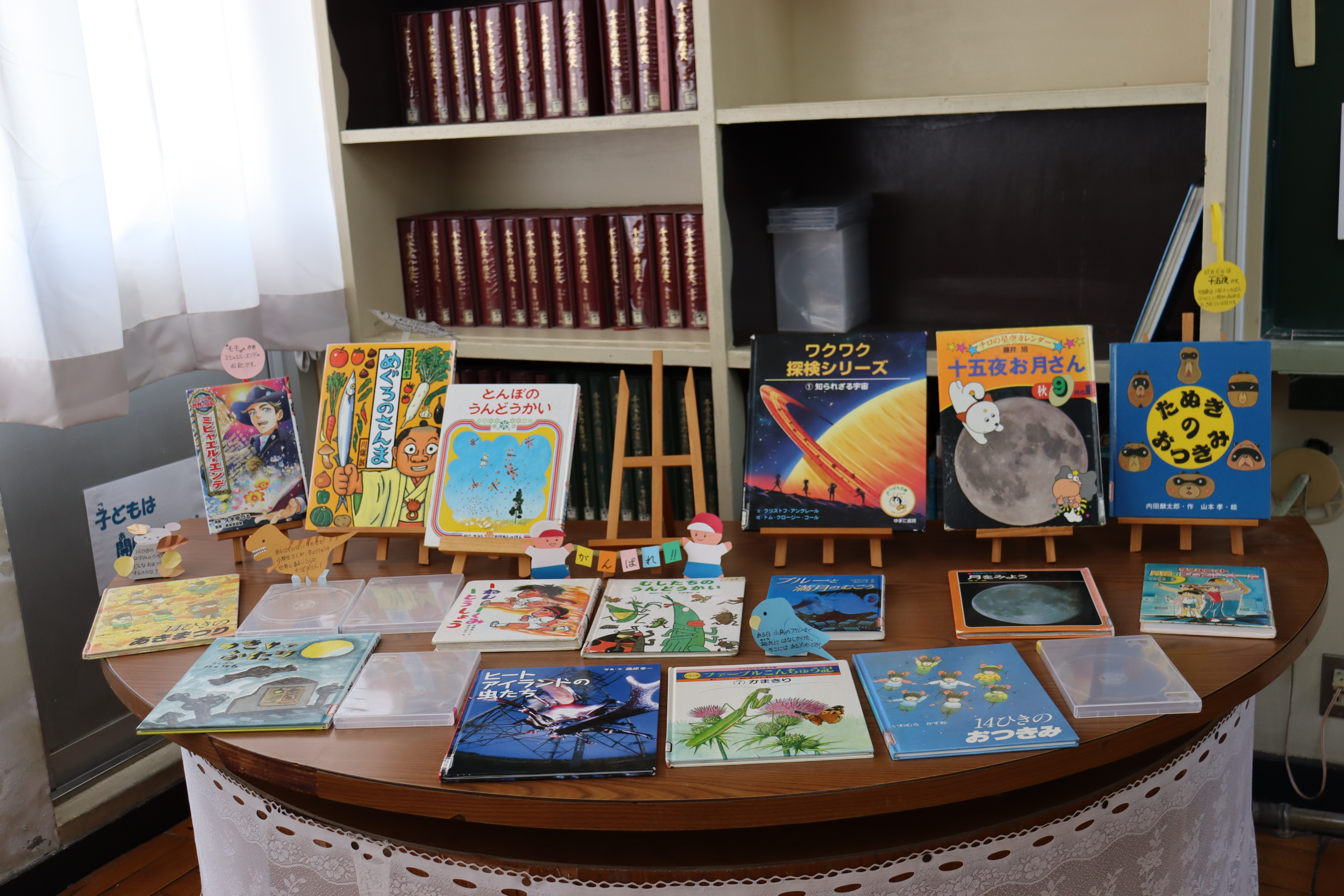 今月のおすすめの本です。子どもたちが手に取りやすいように置かれています。写真の中で代本板(透明ケース)がいくつか置かれているのは、今貸し出し中の本があるということです。たくさんの子どもたちがいろいろな本を手に取り、楽しく読んでくれることを願っています。