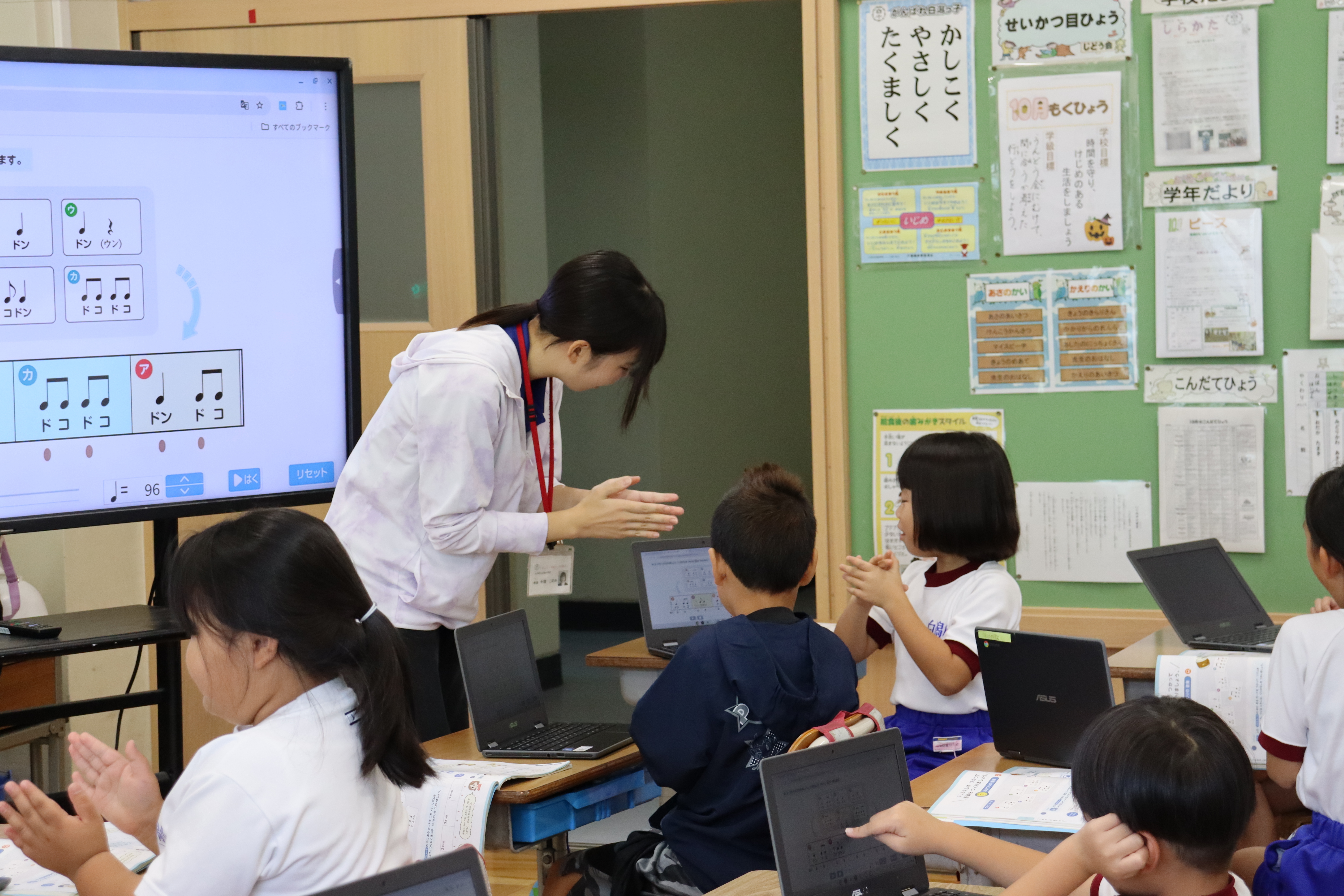 後期になり、1年生の図工を2年生担任の鈴木先生が、2年生の音楽を1年生担任の今関先生が受けもっています。子どもたちは、担任の先生以外の先生に教わり、毎時間新鮮で、集中力が増しているようです。