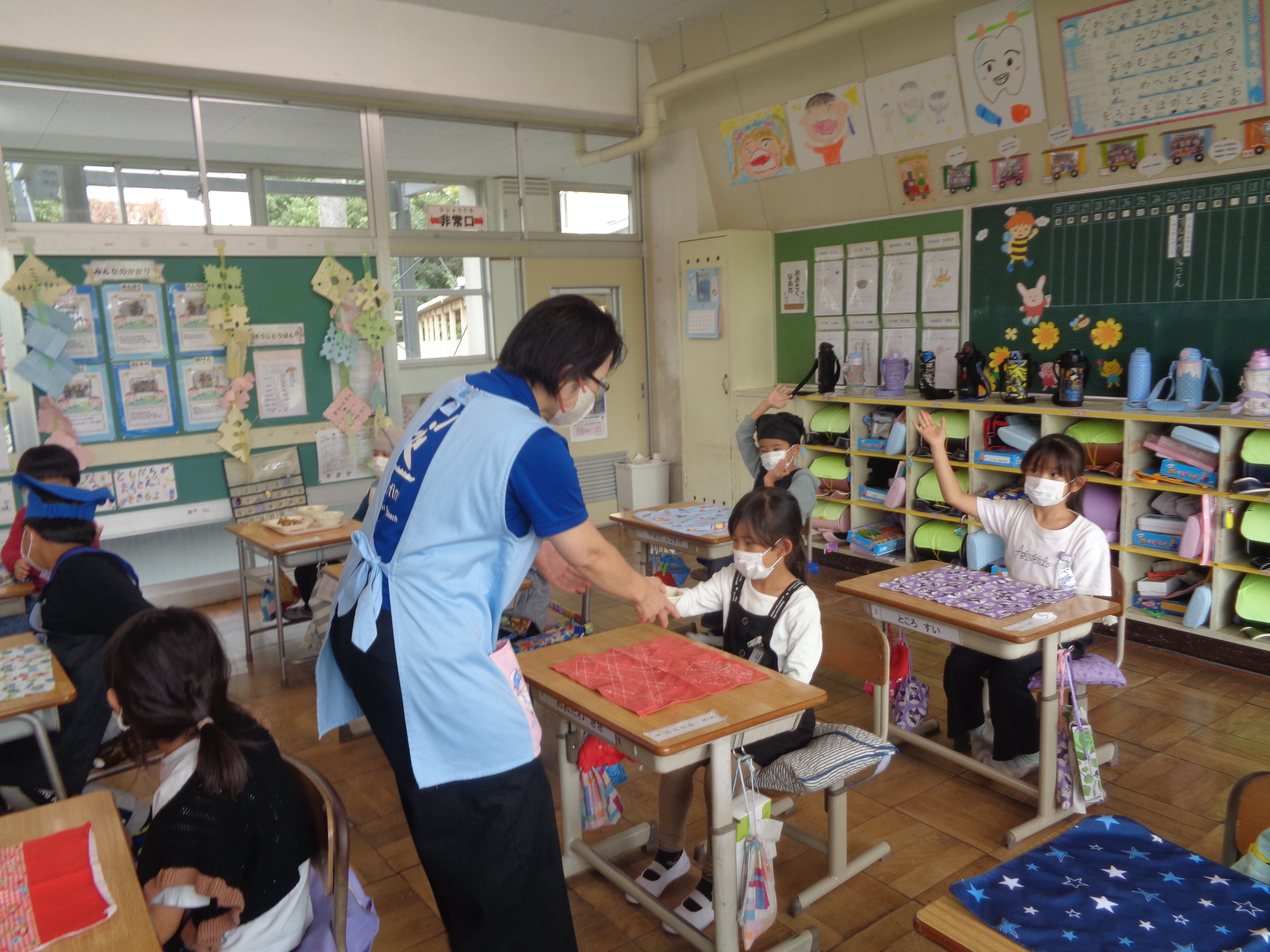 10月23日(木)の給食の時間に、白子町学校給食センターから、古山栄養士が参観にいらしゃいました。今回は、1,2,4年生の教室を回りました。教室では、食べる時の姿勢やお茶碗の持ち方を教えていただきました。「親指は中に入れずに、お茶碗の縁にそっと添えるように持ちましょう。」とお話しすると、子ども達は「できました!」「こんな感じですか?」と見せてくれました。日々の給食を楽しく、美味しく食べられるよう、学校でも指導をしてまいります。