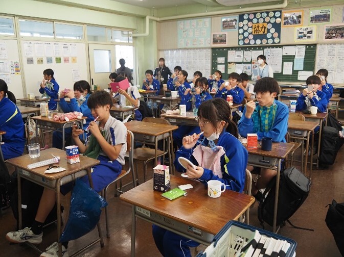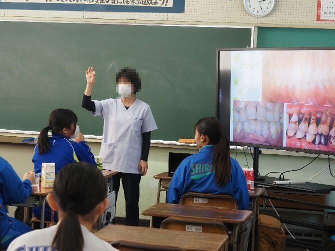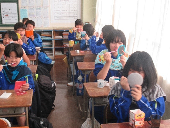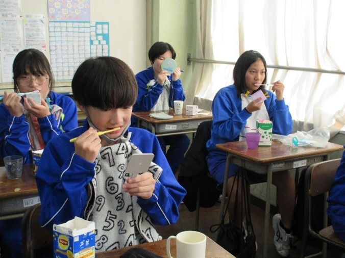 主に歯周病に関する話と、染め出しを用いたブラッシング指導をしていただきました。生徒たちの多くは染め出しを行うことが初めてだったようで、ドキドキした様子や抵抗がある姿もみられましたが、丁寧に磨いてきれいになっていく歯を見て、歯みがきの大切さを学ぶことができたようです。