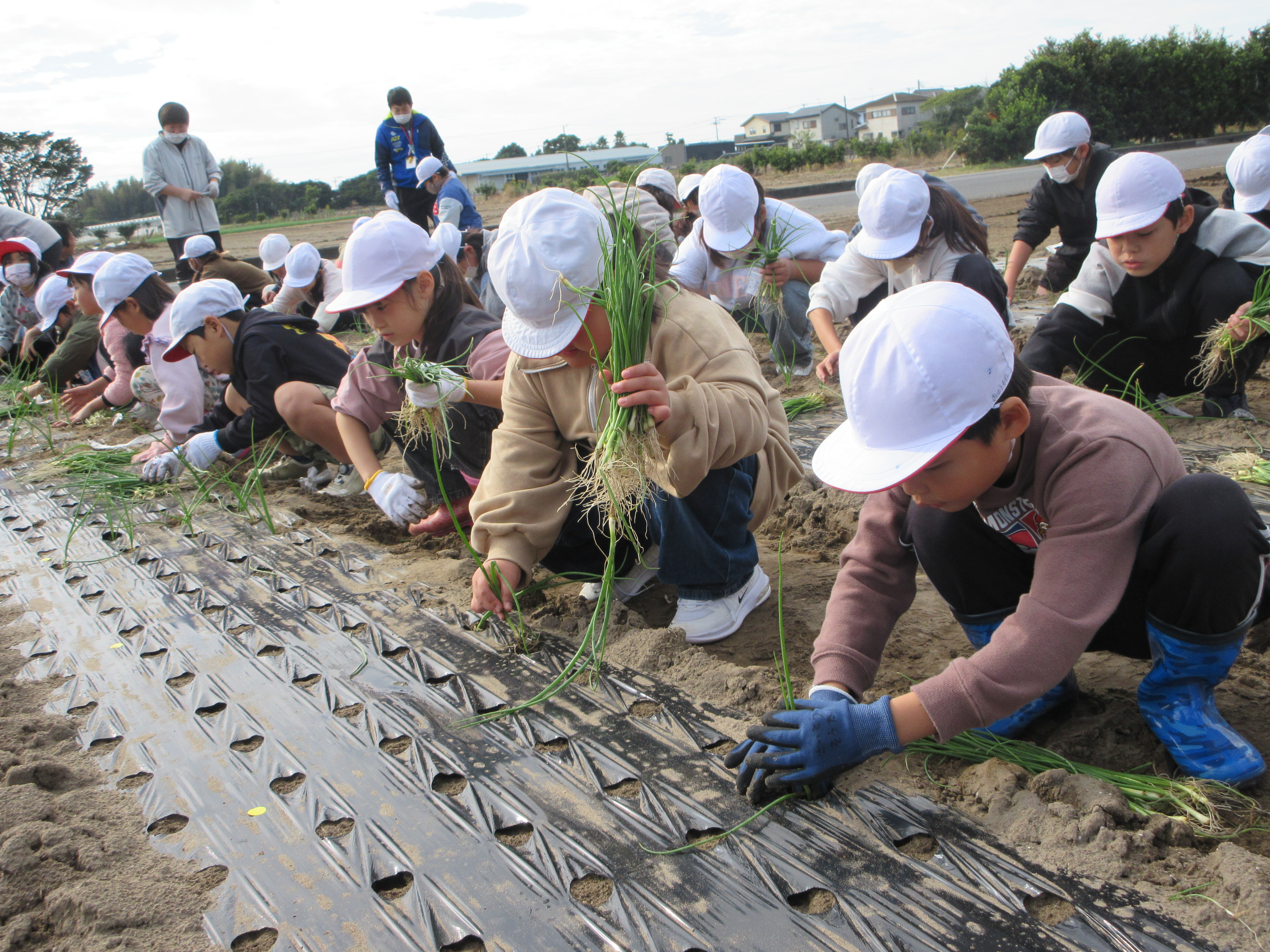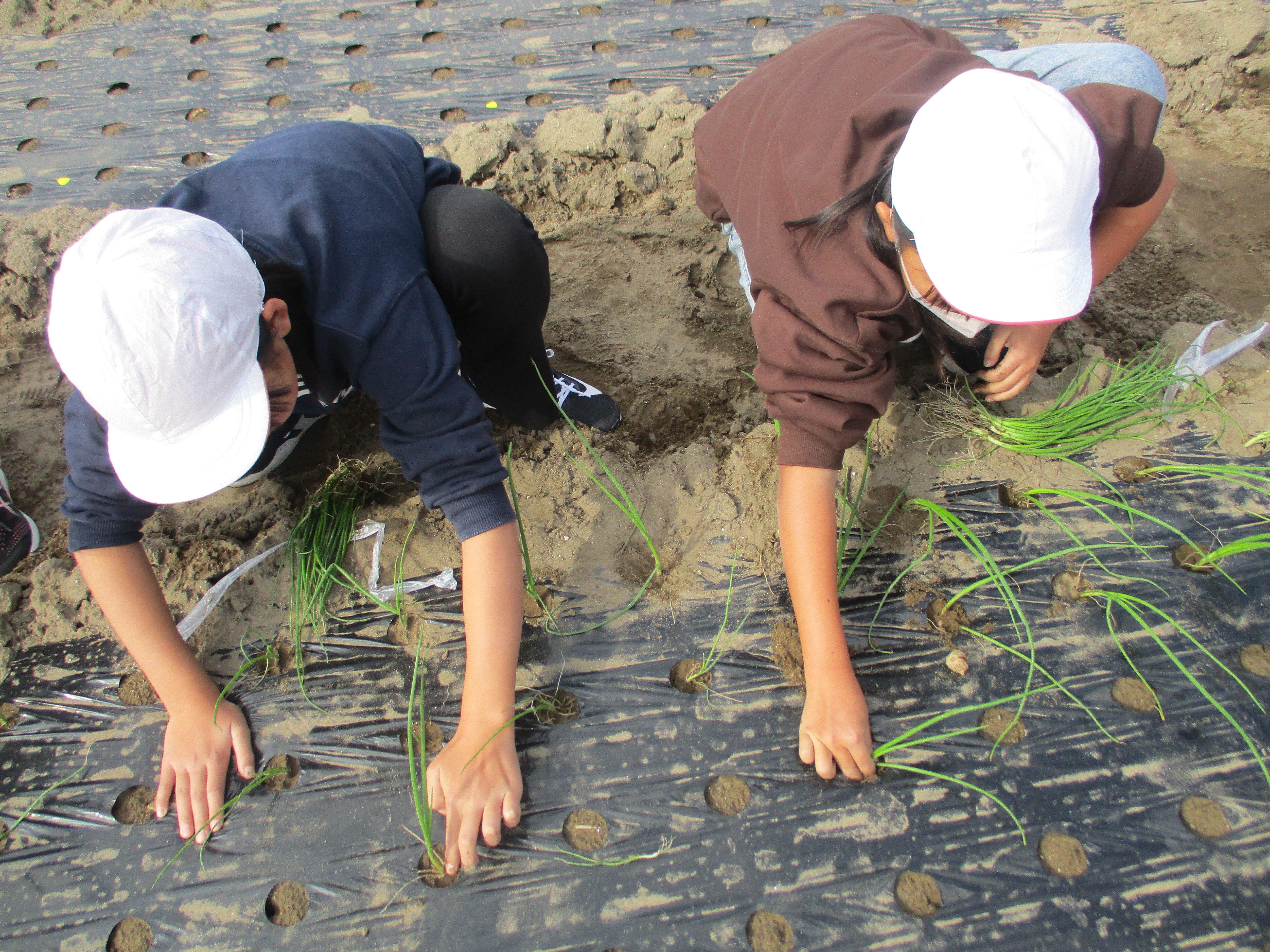 今年も、地域の方、農業士の方、更生保護女性会の方のご支援を受けて、玉ねぎの苗植えを行いました。毎年行っている高学年は手際よく、慣れていない低学年は友達や先生、お手伝いの方々に教えてもらいながら一生懸命に25本の苗を植えました。来年の初夏に大きな玉ねぎを収穫するのが今から楽しみです。