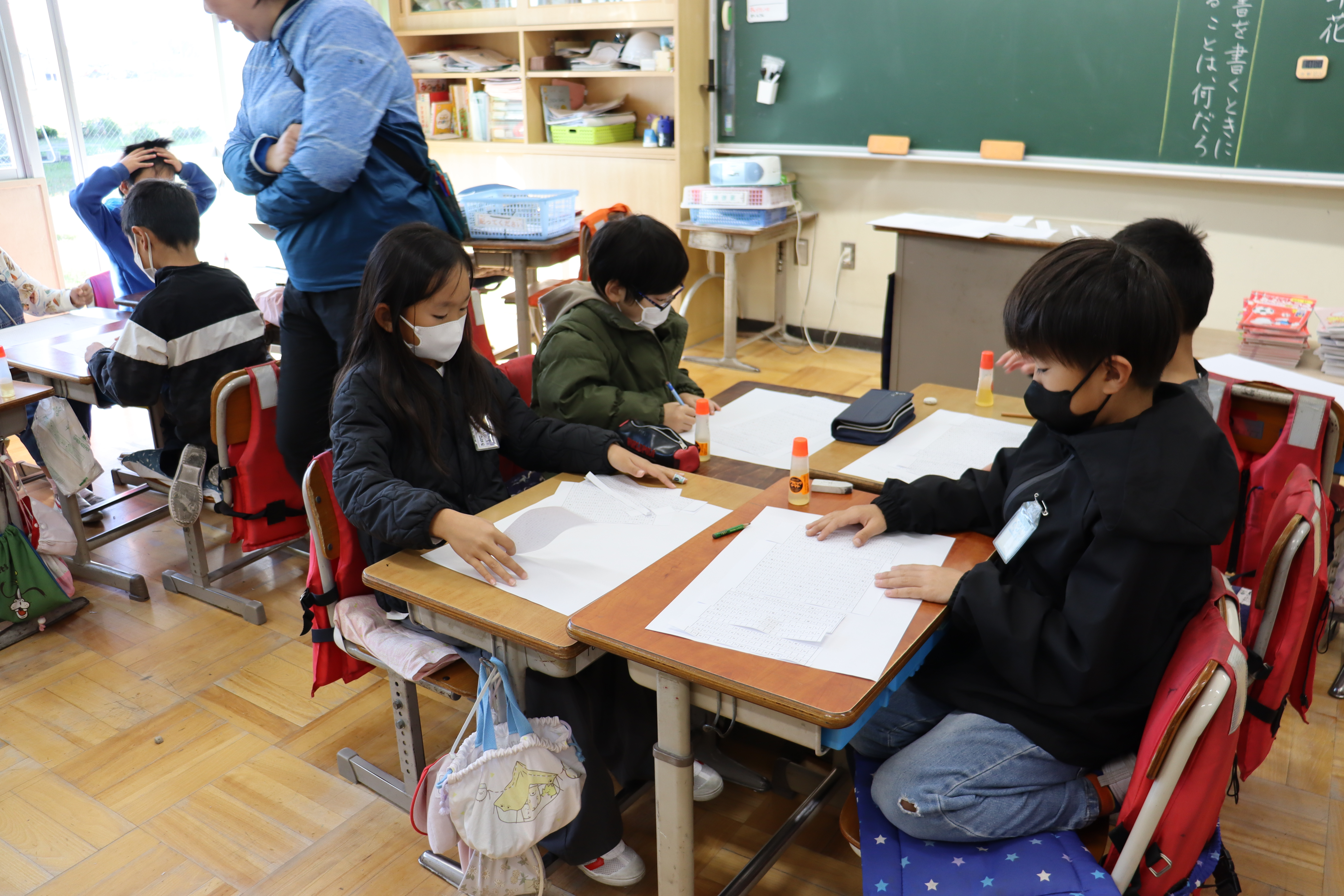 説明書を書く学習。「紙コップ花火の作り方の説明文」を段落ごとにばらばらに切り分けたものを、班の友達と協力して「順番ことば」に注目しながら並びかえました。並び替えができたかどうかみんなで確かめ、うまくできたときには喜びの歓声が上がりました。