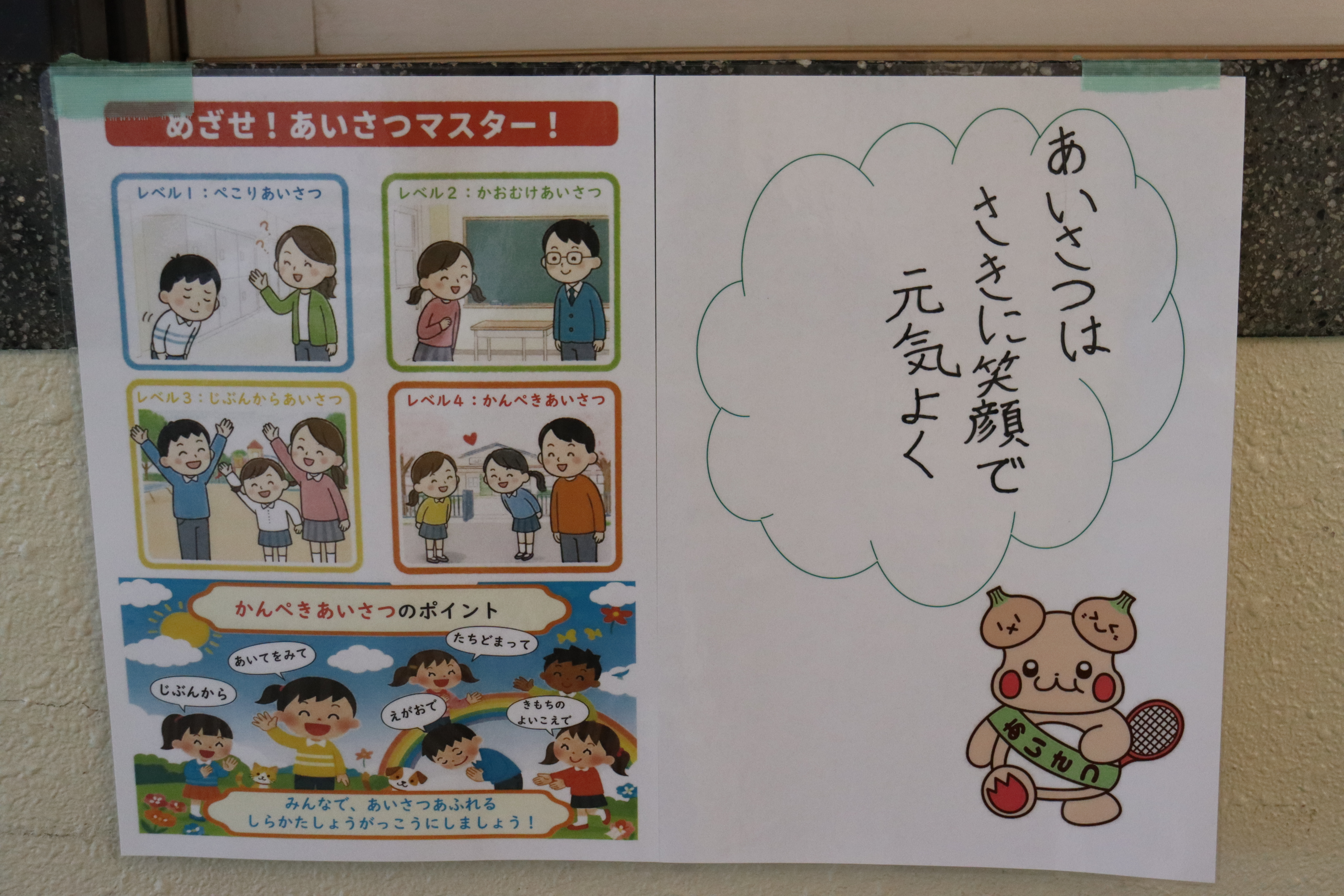 校舎内のあちらこちらに、このようなポスターが貼ってあります。職員が作った「めざせ!あいさつマスター」というポスターに児童会の子どもたちが、自分たちで考えた標語を加えました。した人、された人、両方の気持ちをよくするようなあいさつができる「あいさつマスター」をみんなでめざします。