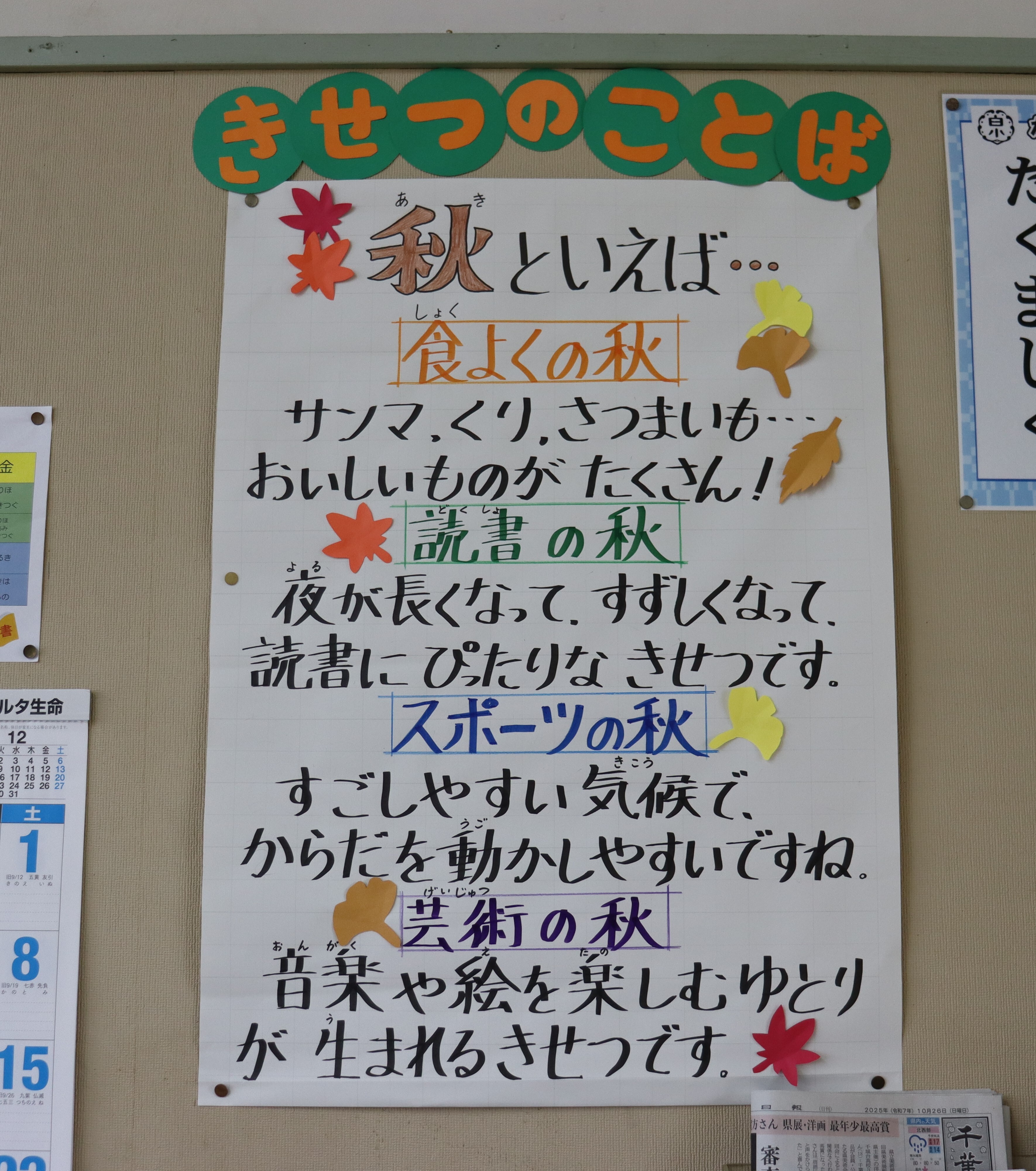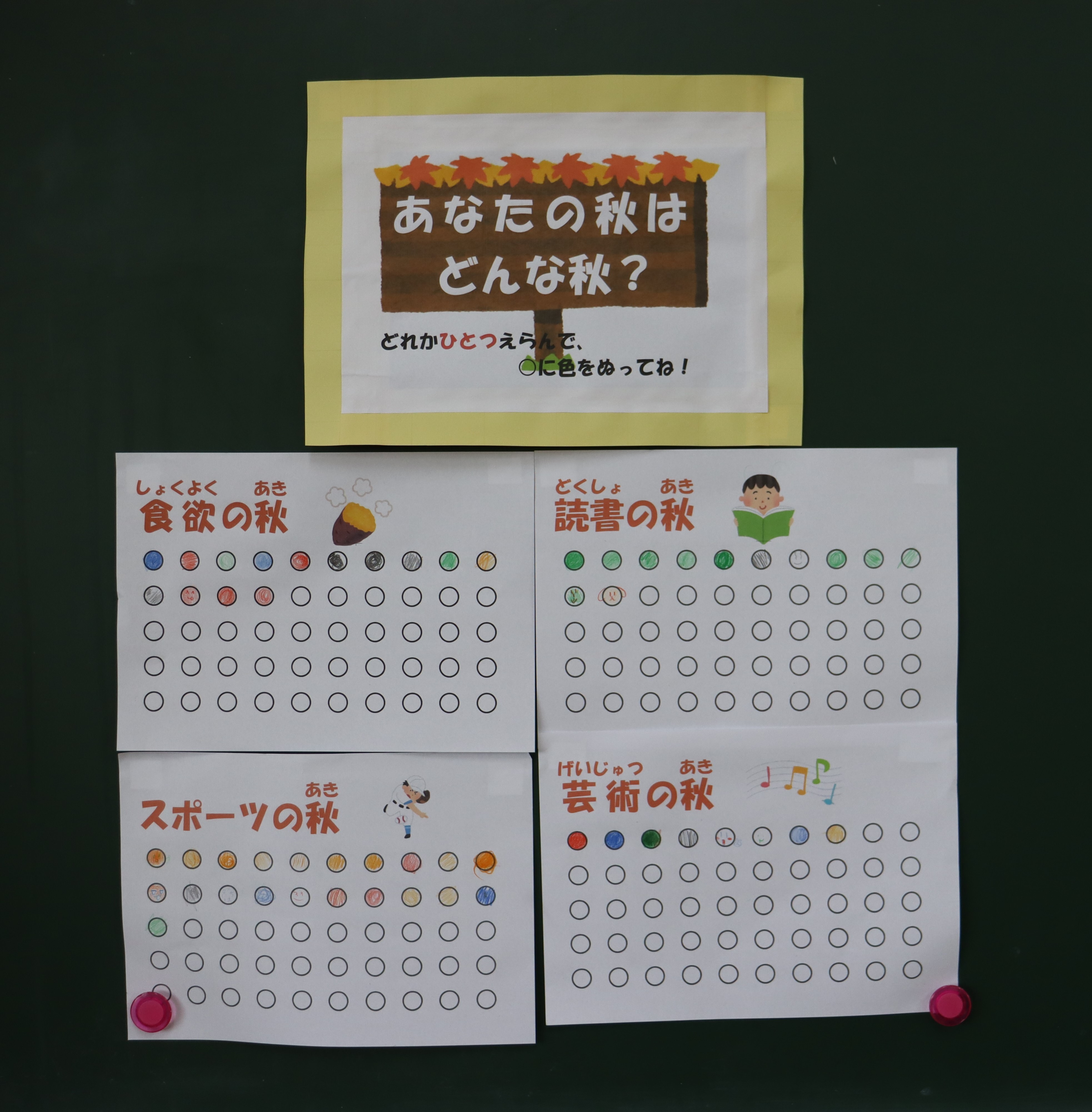 図書室も秋の装い① 11月11日(火)図書室の中が秋に様変わり。私の秋はどんな秋?などと考えながら図書室へ行くのが楽しみです。