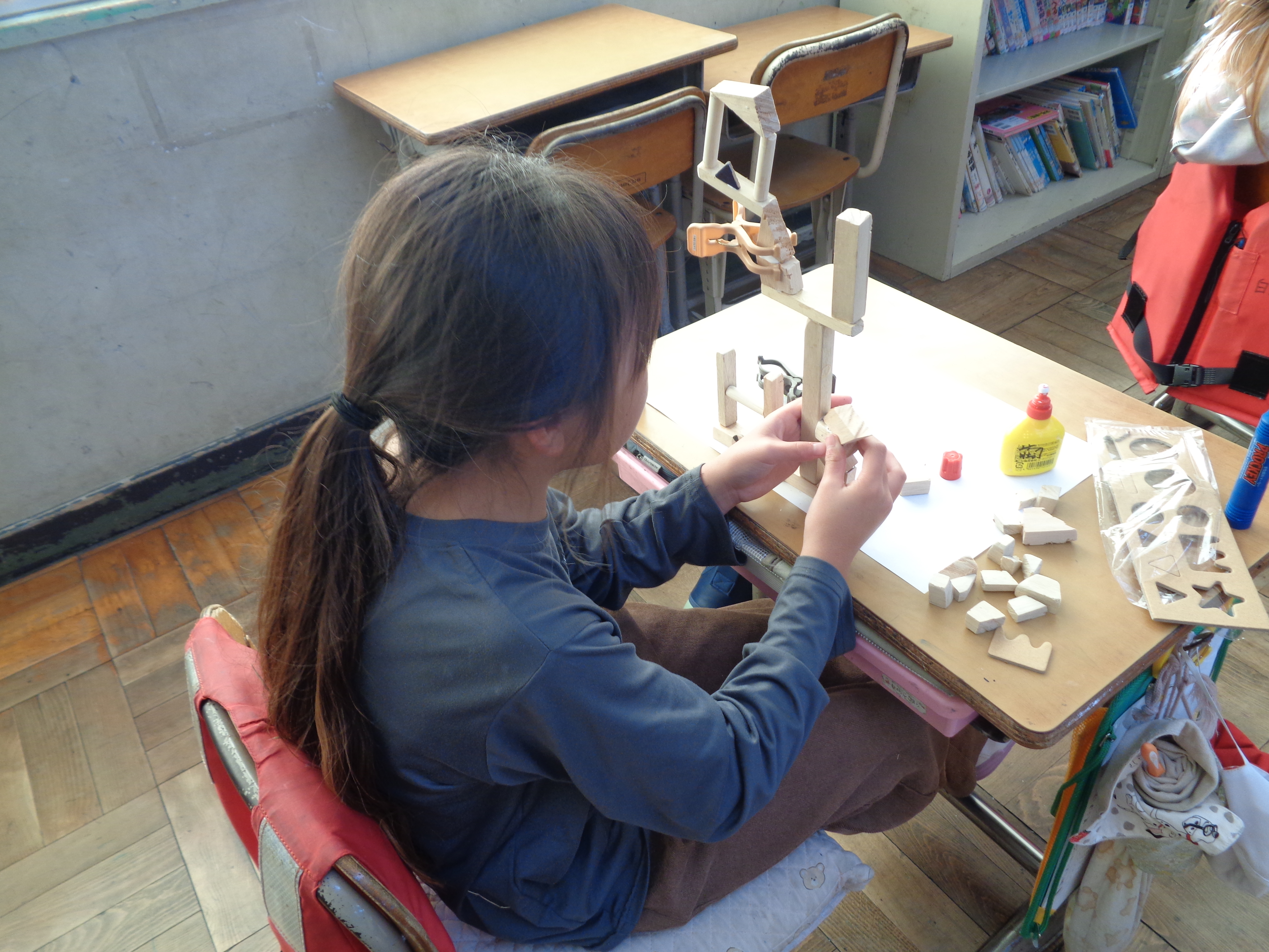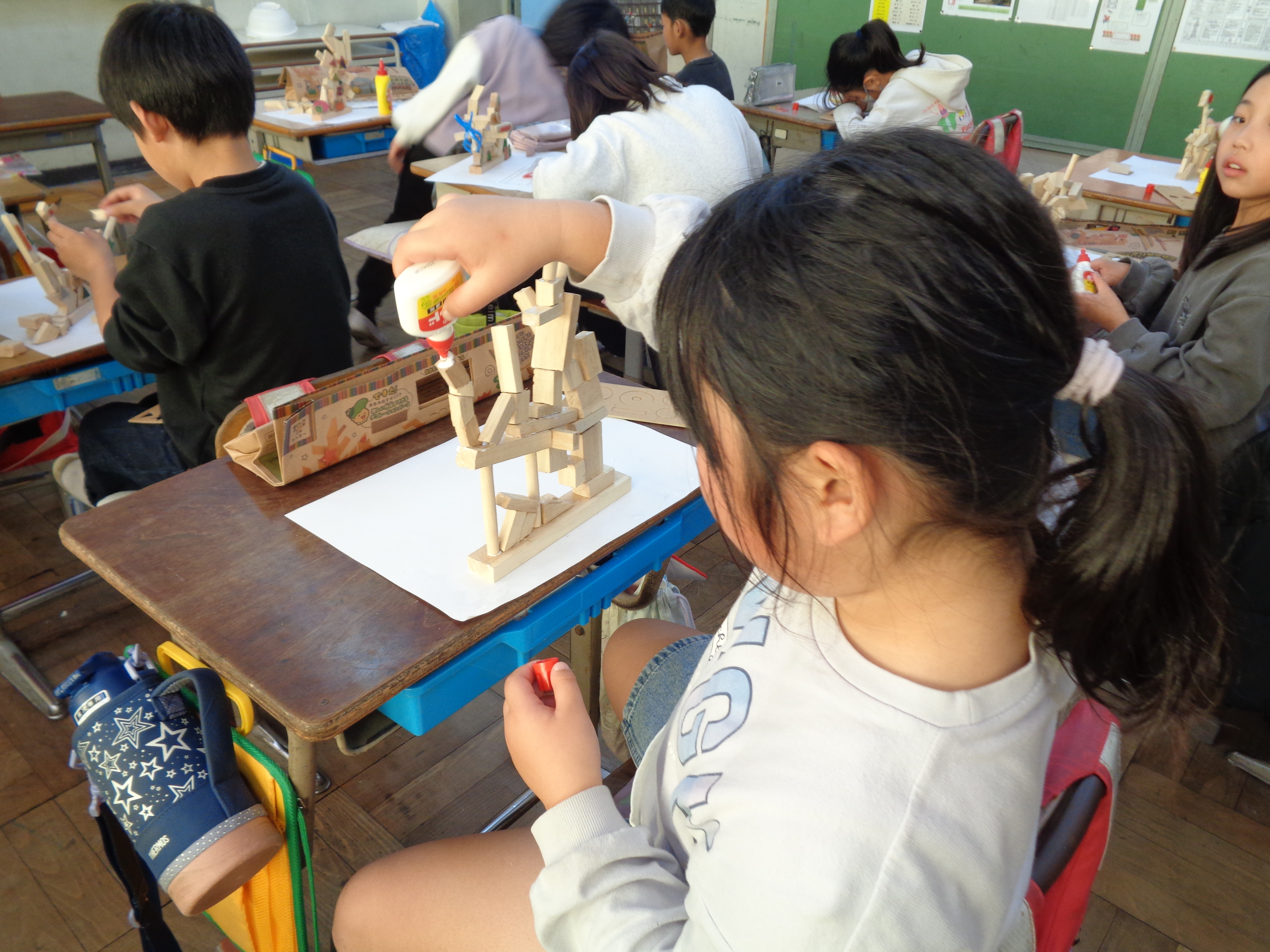 「のこぎりザクザク つないでつけて」の学習では、のこぎりの使い方を学びました。子どもたちは、「のこぎりを引くときに力を入れる」というポイントをしっかりと押さえて木を細かく切ることができました。頑張って切った木をバランスよく組み合わせたり積み上げたりし、たった一つの素敵な作品ができあがりました。