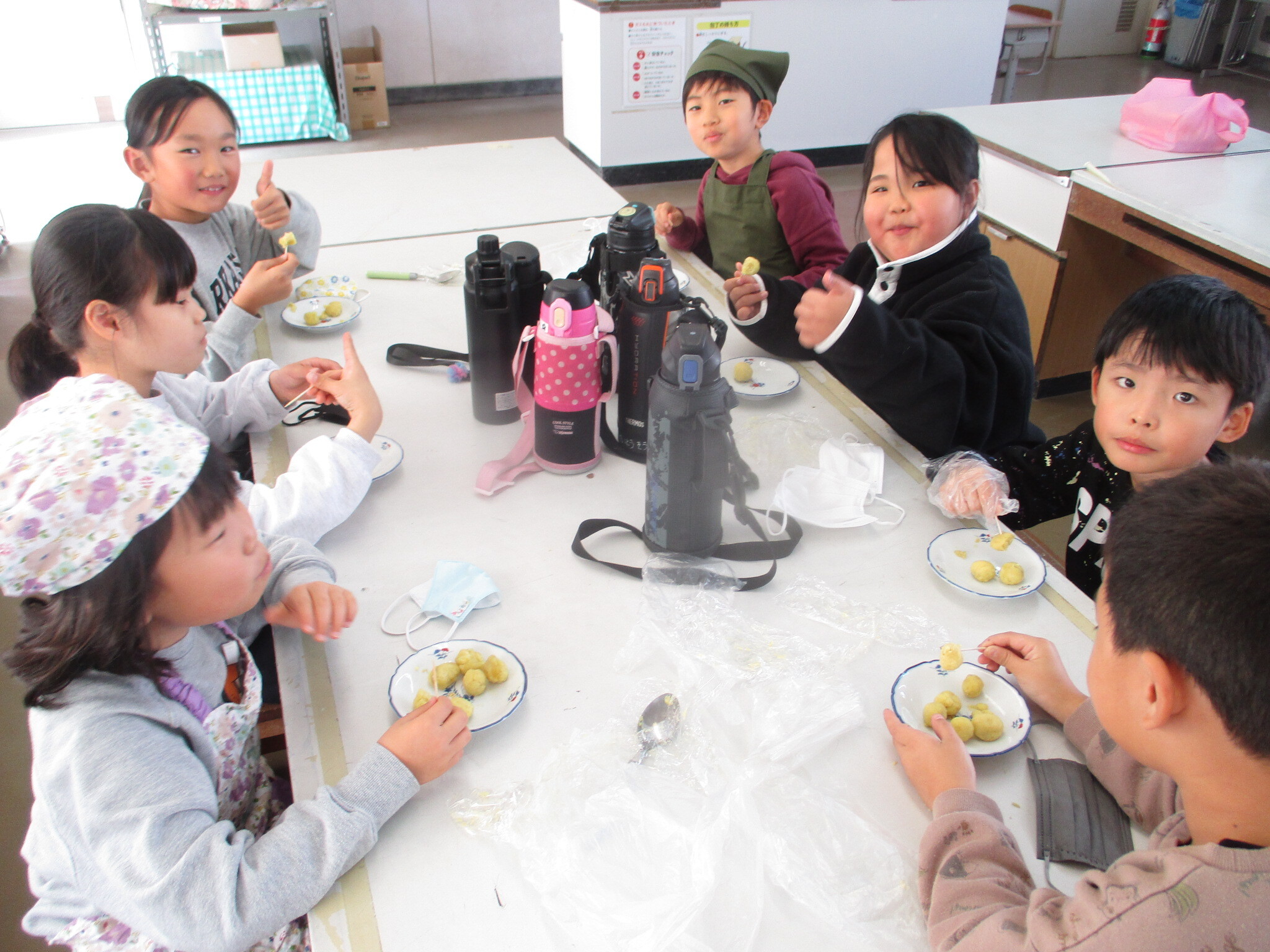 生活科の学習で育てたサツマイモをみんなで料理しました。切る、茹でる、つぶす、丸めるの行程を経て、おいしいイモきんちゃくができました。