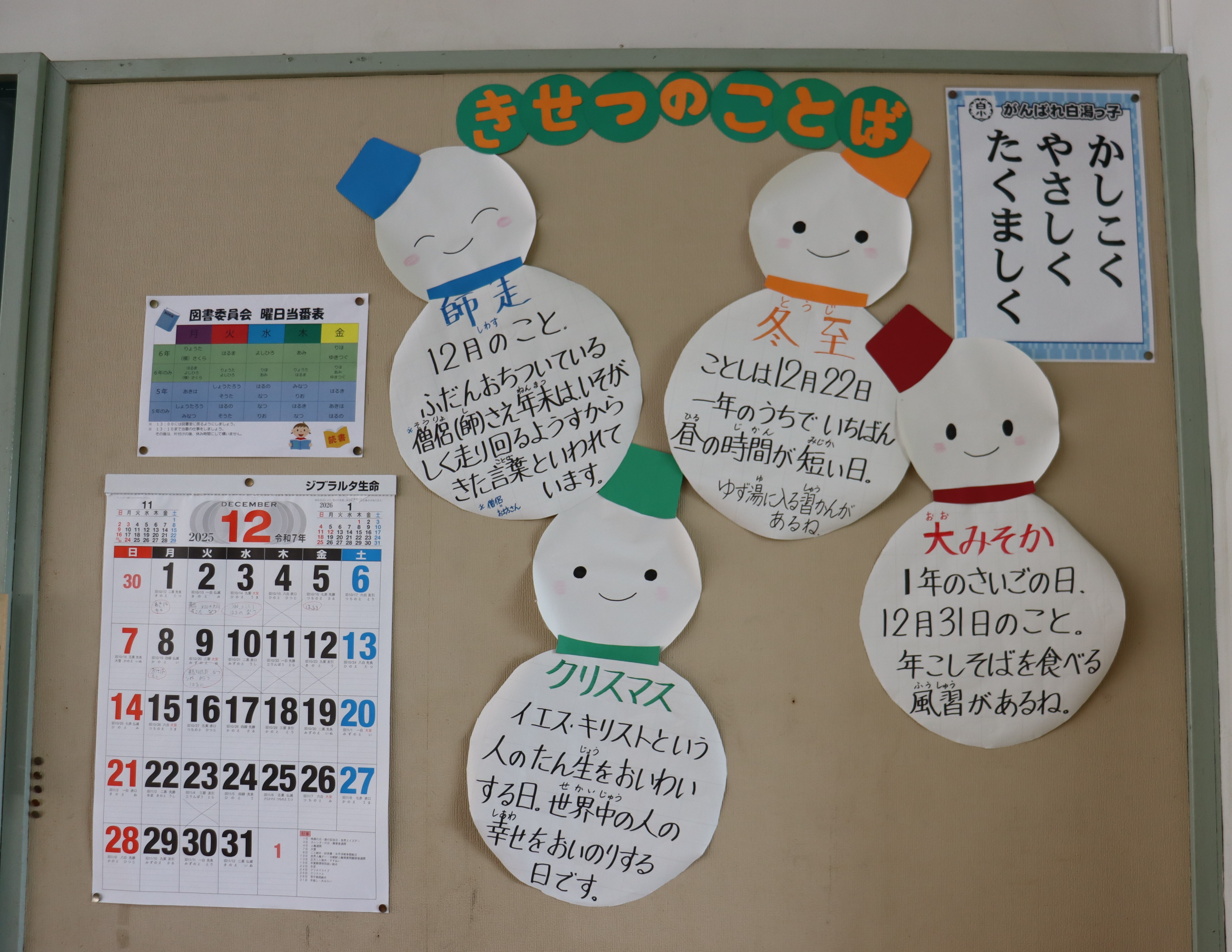 図書室には「冬のおすすめ」の本が紹介されています。冬休みは、一人2冊まで本を借りることができます。暖かい部屋でゆっくり読書。いいですね。また、12月16日(火)~1月30日(金)は白潟小学校の読書月間です。「たくさん本を読んで、ごほうびしおりをゲットしよう!」