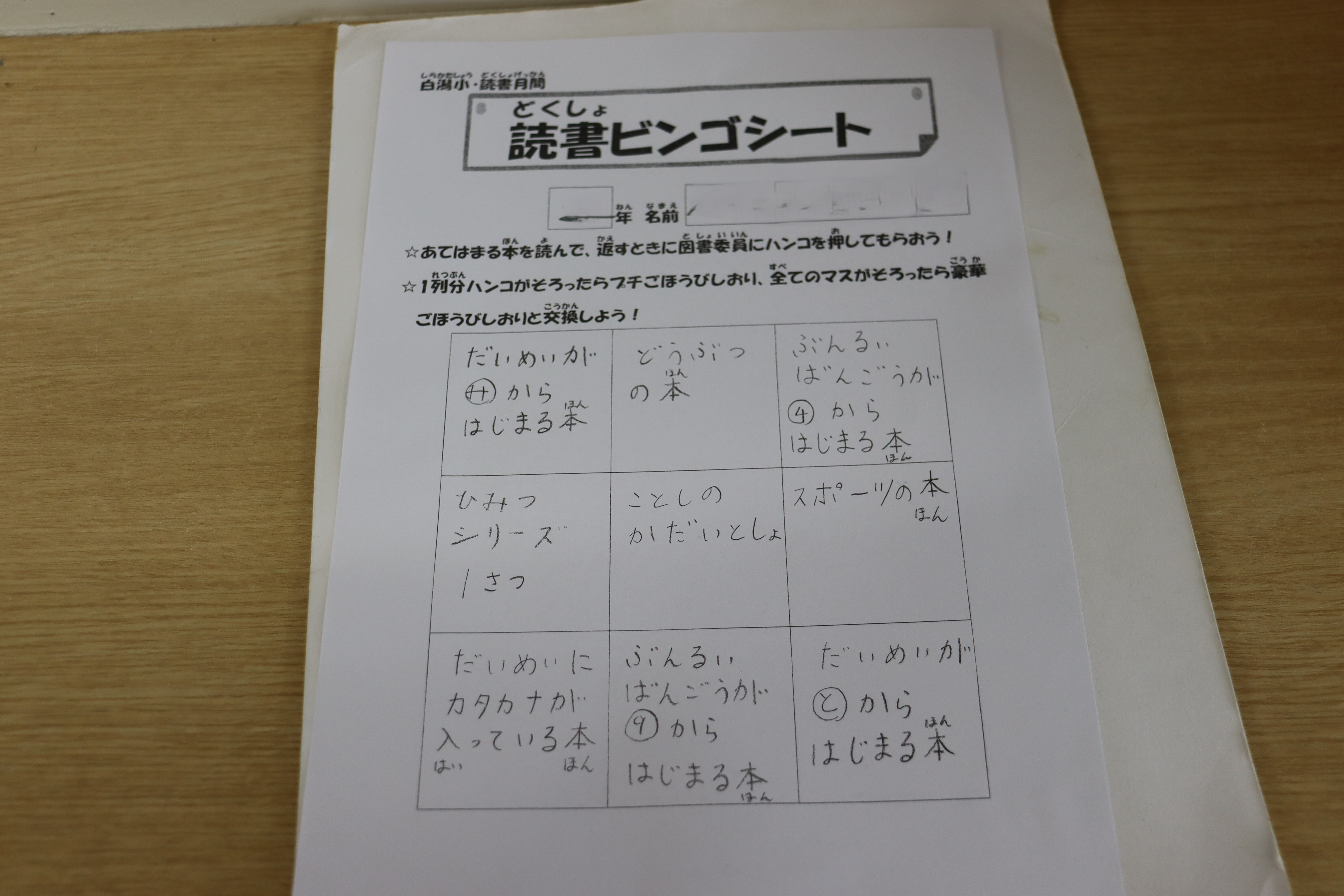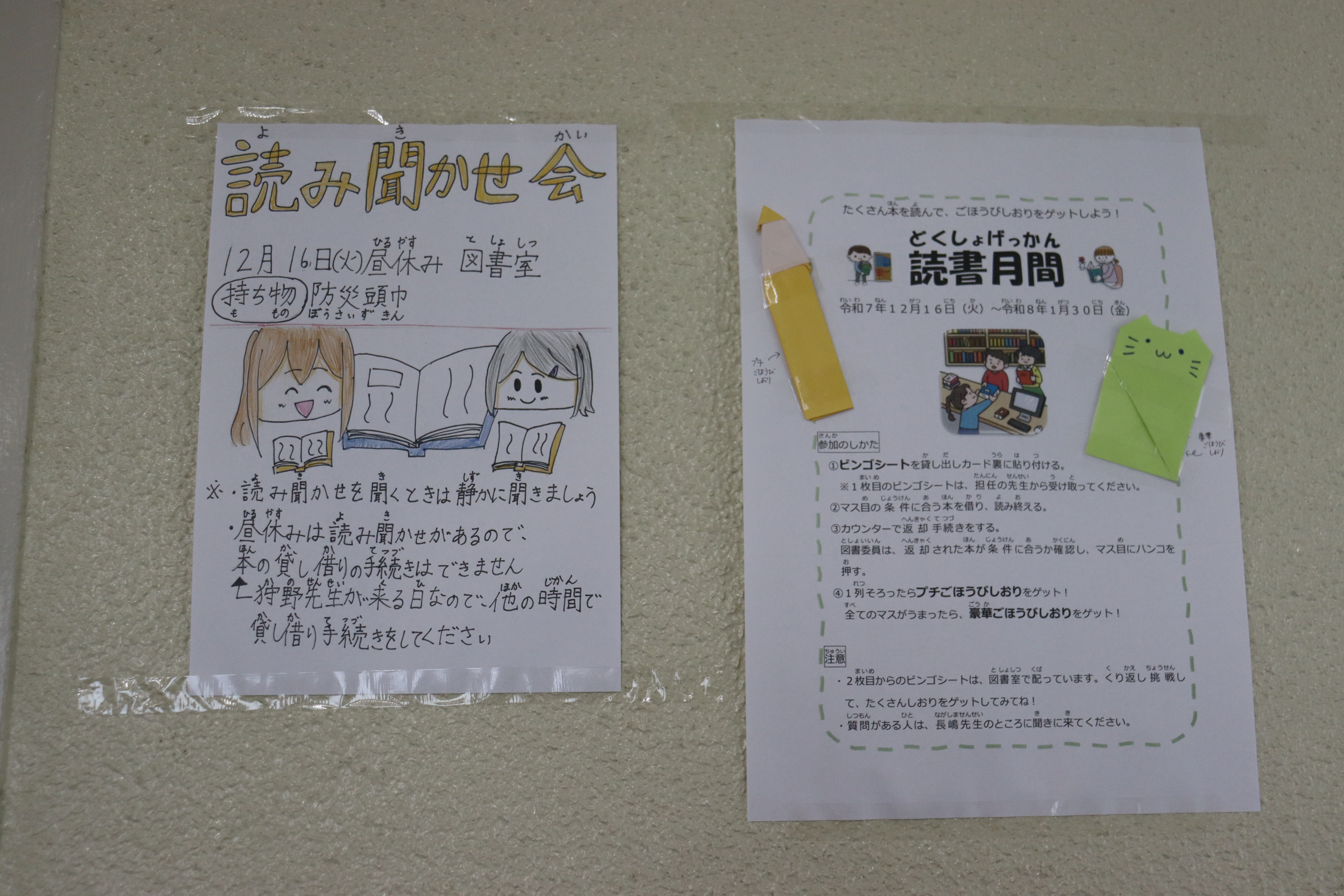 読書推進活動として、読書月間を設けています。子どもたちが本に興味をもち、読書は楽しいと思ってもらえるような企画をいくつか用意しました。12月16日には図書館司書による読み聞かせ会が予定されています。図書委員会の児童がポスター作成し、みんなに知らせてくれました。読書月間中に行われている「読書ビンゴ」は、ビンゴ用紙に、「動物の本」「題名にかたかなが入っている本」など9種類の条件が書かれていて、条件に合った本を読みビンゴになると、図書委員が折り紙で作ったしおりをもらえるというものです。子どもたちは楽しみながら読書をすすめています。