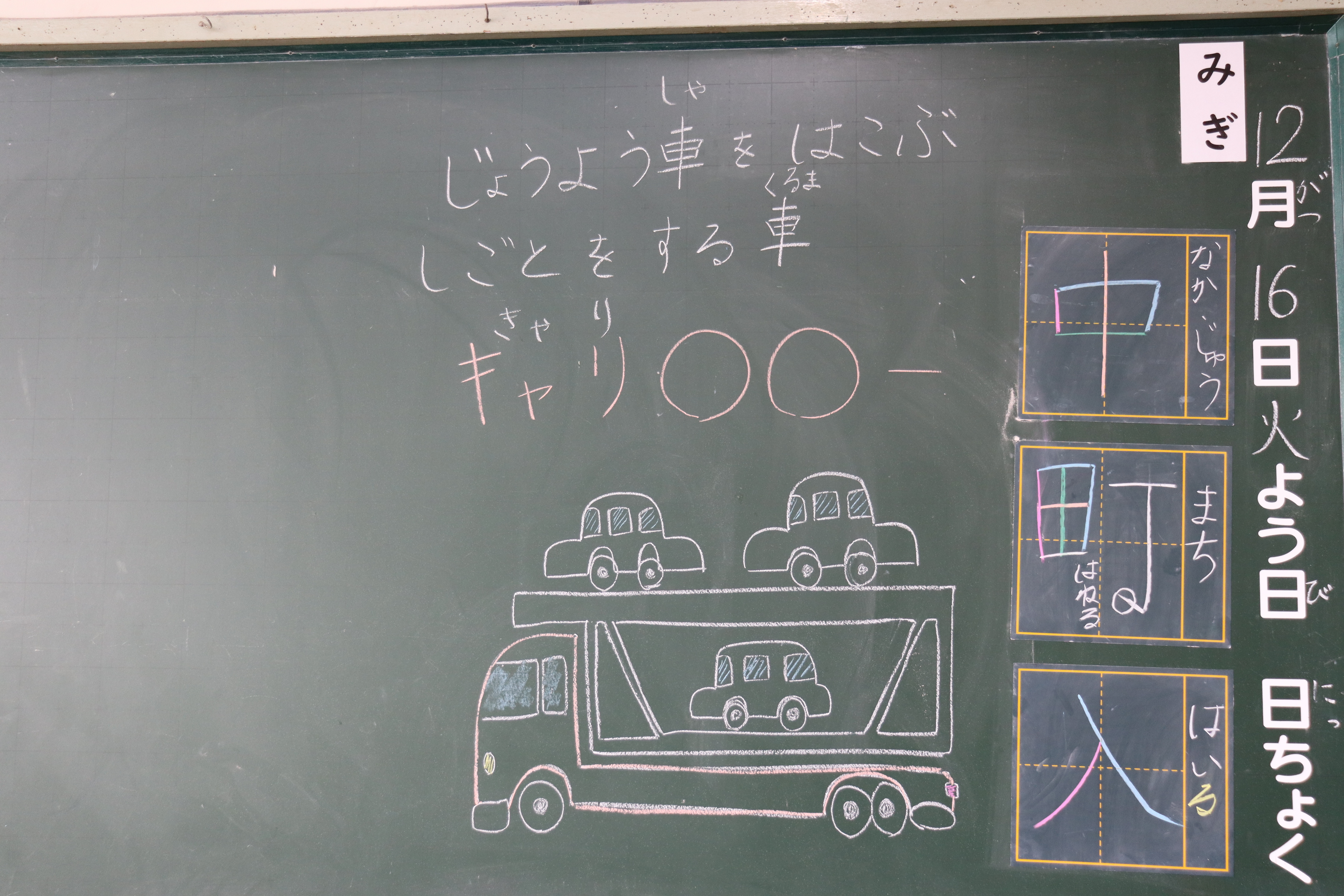 1年生では、毎朝、担任が黒板に動物や乗り物などの絵を描きます。初めのころは、文字を覚えたり読んだりすることがこの取り組みのメインでしたが、11月頃からは、教室にある本や教科書に出てくる本の中から、一つ題材を選び描いておきます。子どもたちは、朝教室に入ると、自然とそれらを目にし、声に出して読んだり、黒板の前にさりげなく置かれた本に興味をもって手を伸ばしたりしています。