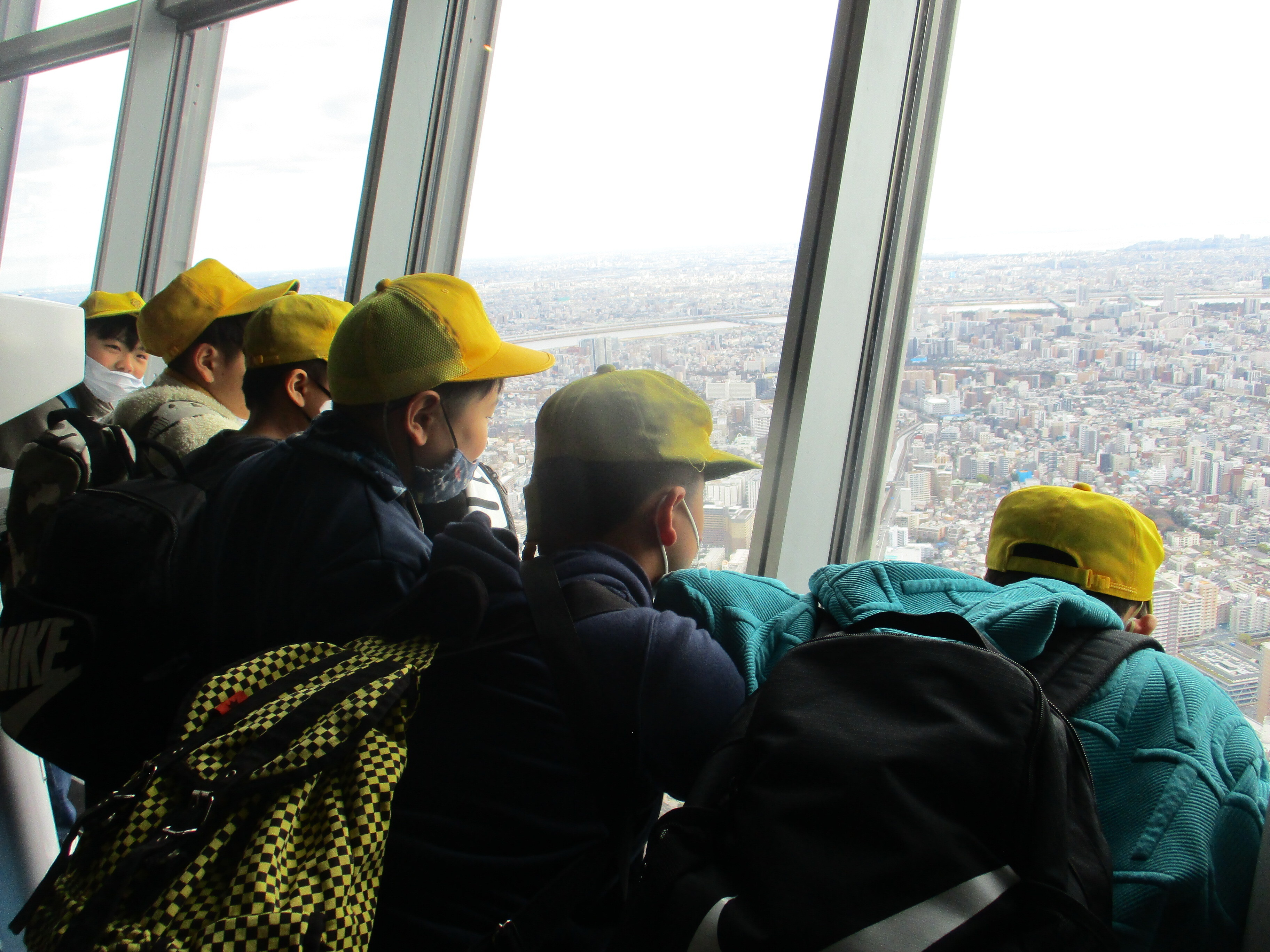 晴天に恵まれ、行きのバスの中からそびえたつスカイツリーが見えたときは、子どもたちから「見えた!わあ、高い」という声が上がりました。スカイツリーの展望台からは東京の街が一望でき、東京ドーム、東京タワーなどをみんなで探しました。本所防災館では、台風や地震などが起きたときの状況を体験しました。暴風雨や大きな揺れを身をもって体験したことで、防災意識を高めることができました。