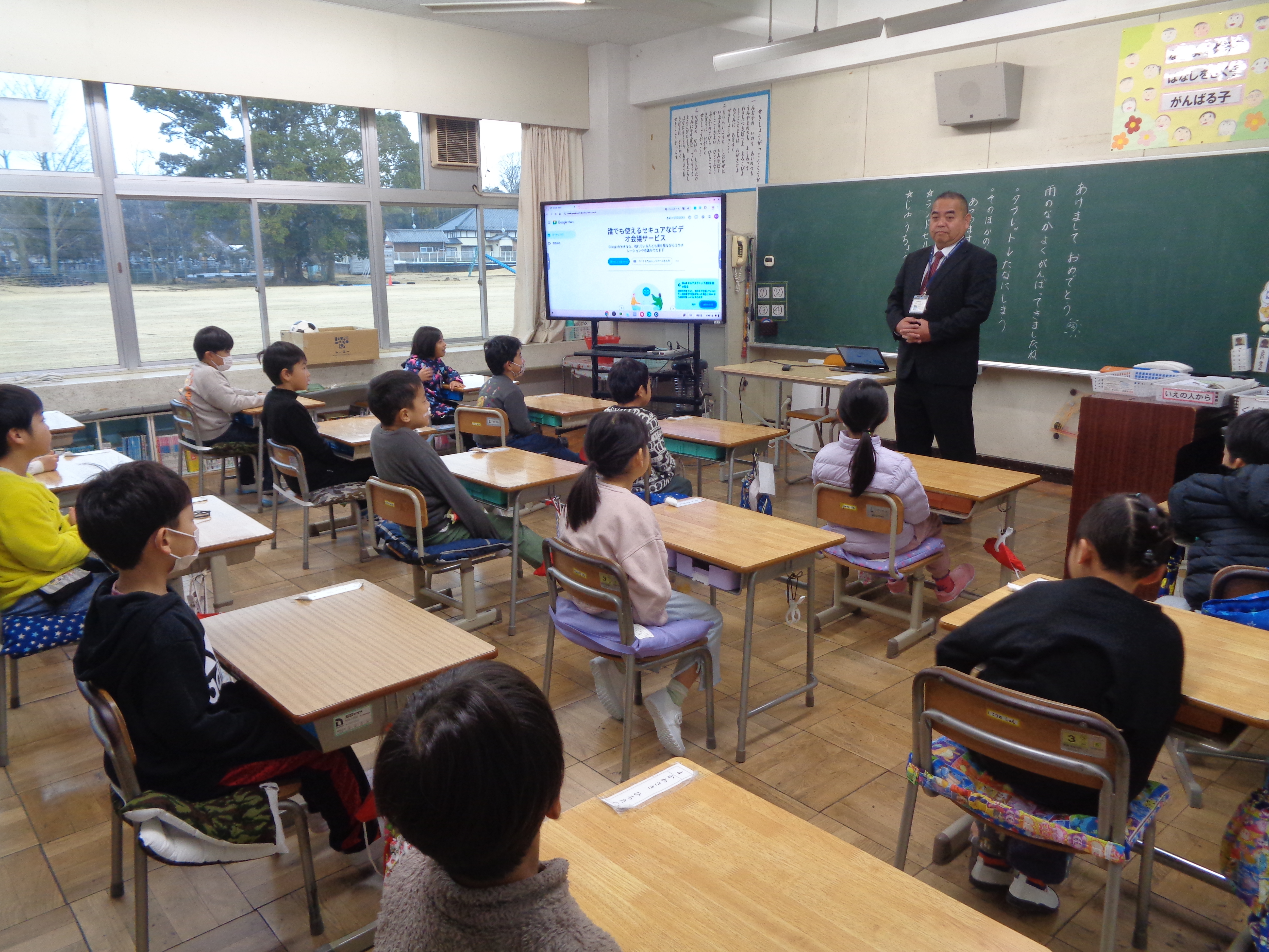 1月7日、元気な関っ子たちが学校に戻ってきました。1時間目は、オンラインで校長先生の話を聞きましたが、1年生はパソコンの調子が悪かったため、急遽校長先生をお呼びして、直接話を聞きました。