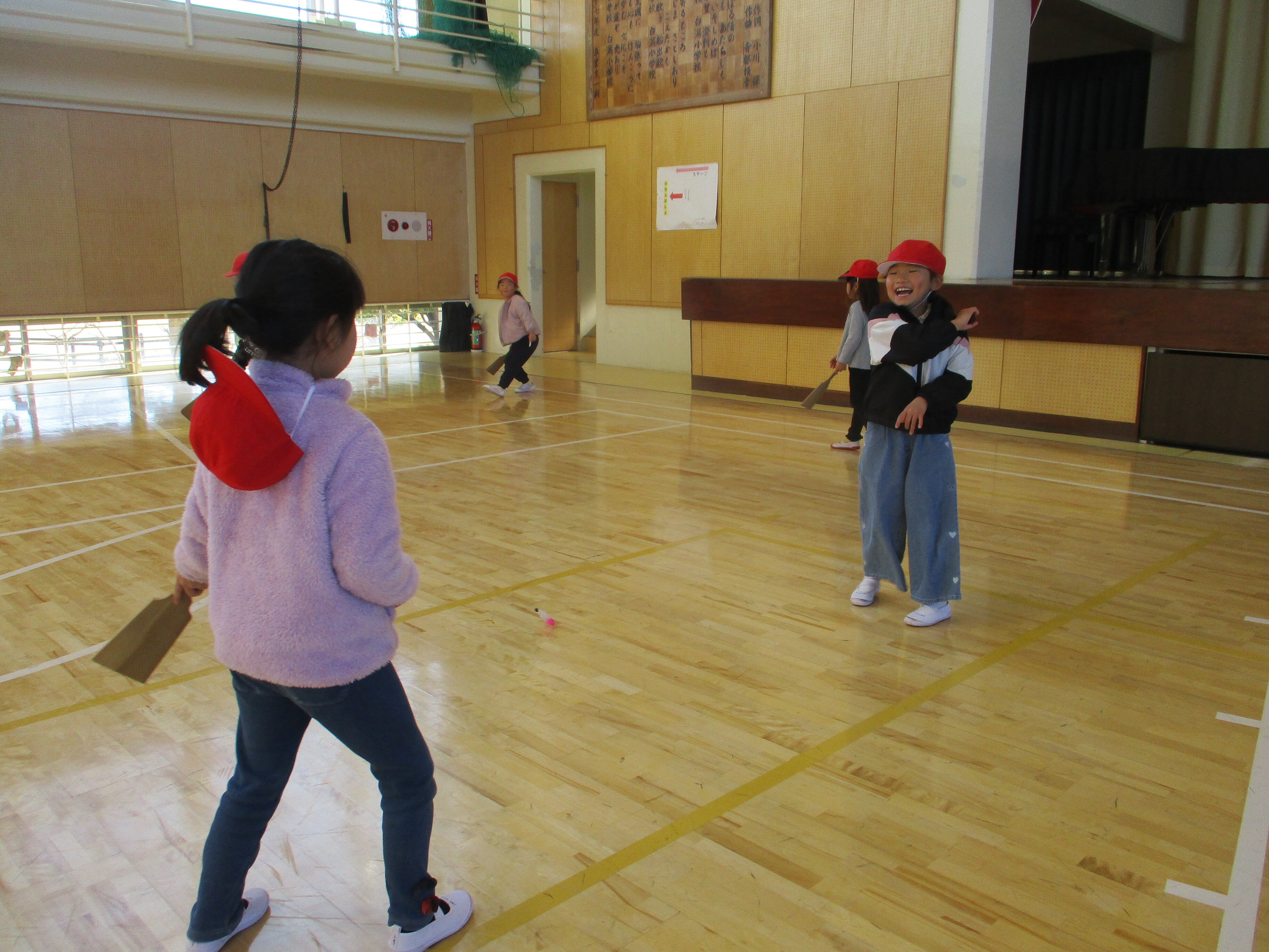 生活科の学習で、昔のあそび体験を行いました。今では遊ぶ機会が少なくなった、けん玉、羽根つき、かるた、お手玉などを友達同士で遊び方を教え合いながら楽しみました。