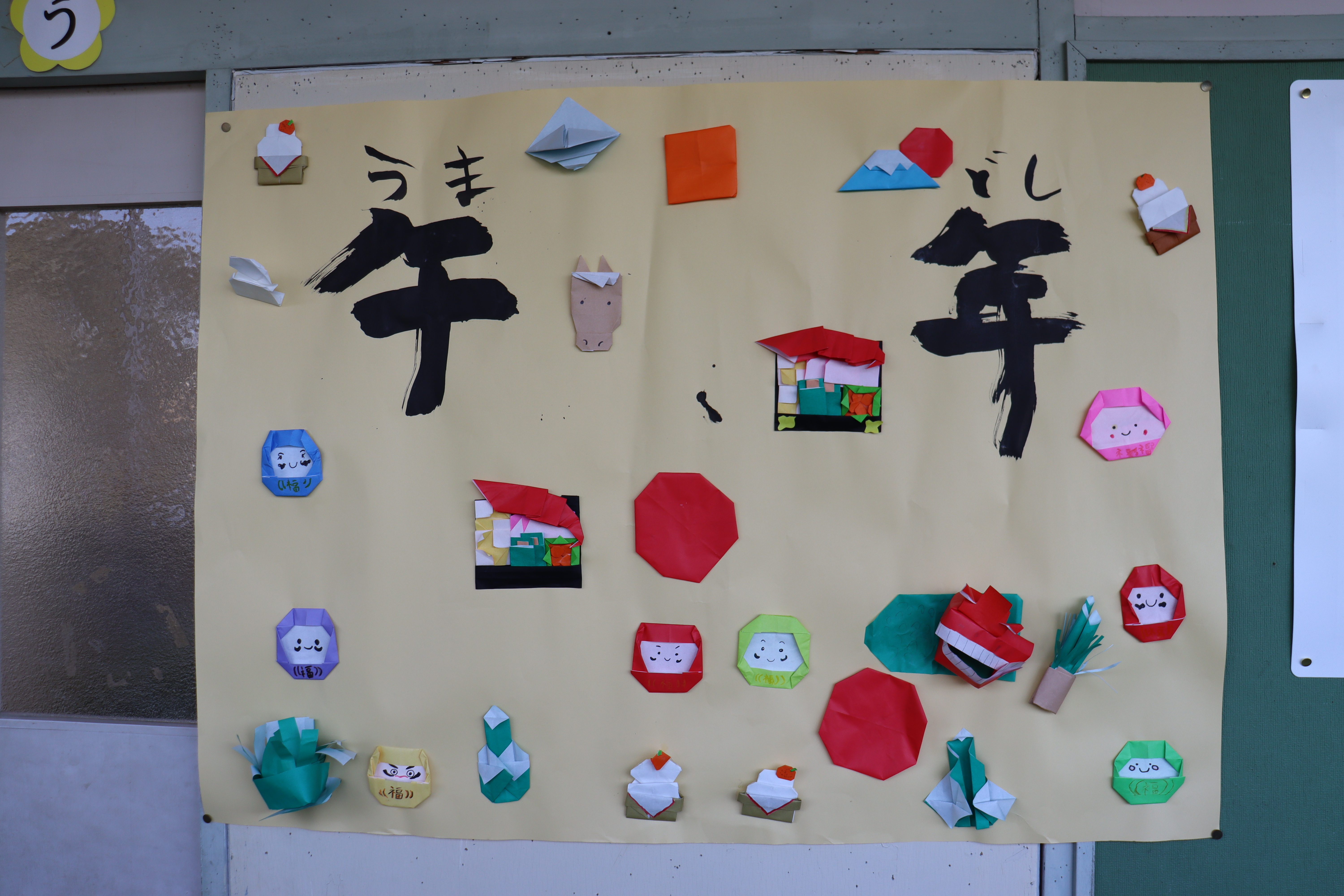 あおぞら・こだま学級の子どもたちが、午年(お正月)をテーマに作品作りに挑戦しました。折り紙で、鏡餅やおせち料理、だるまや獅子舞などを作り、模造紙にバランスよく貼りました。すてきな一年になりそうです。
