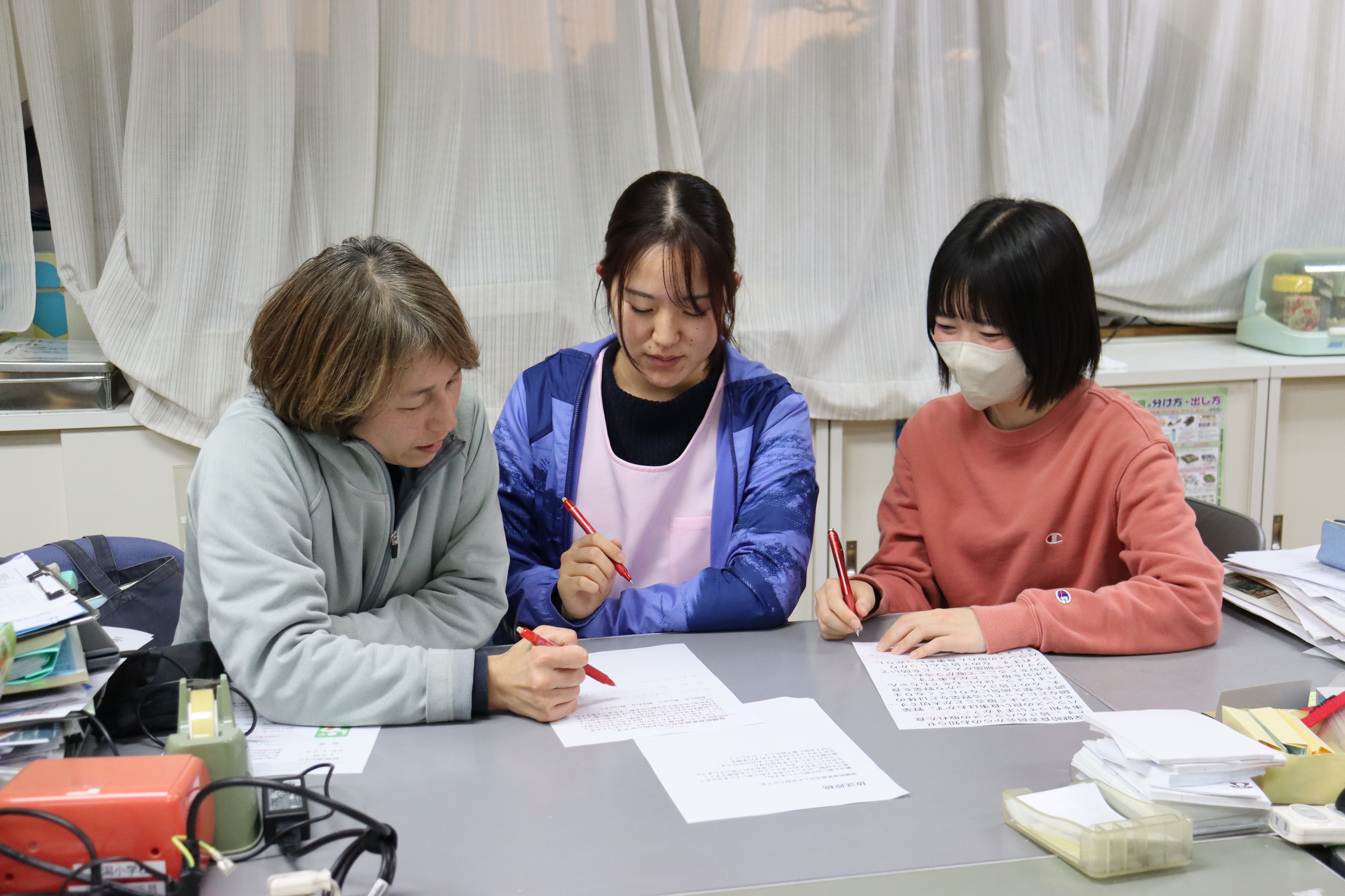 保健給食委員会では、「寒い冬を元気にすごすには」をテーマに、「給食をしっかり食べる」「手洗いうがいをしっかりする」といった内容を昼の放送で全校児童に呼びかける予定です。この写真は、委員会の児童が考えてきた放送原稿を担当職員で推敲しているところです。