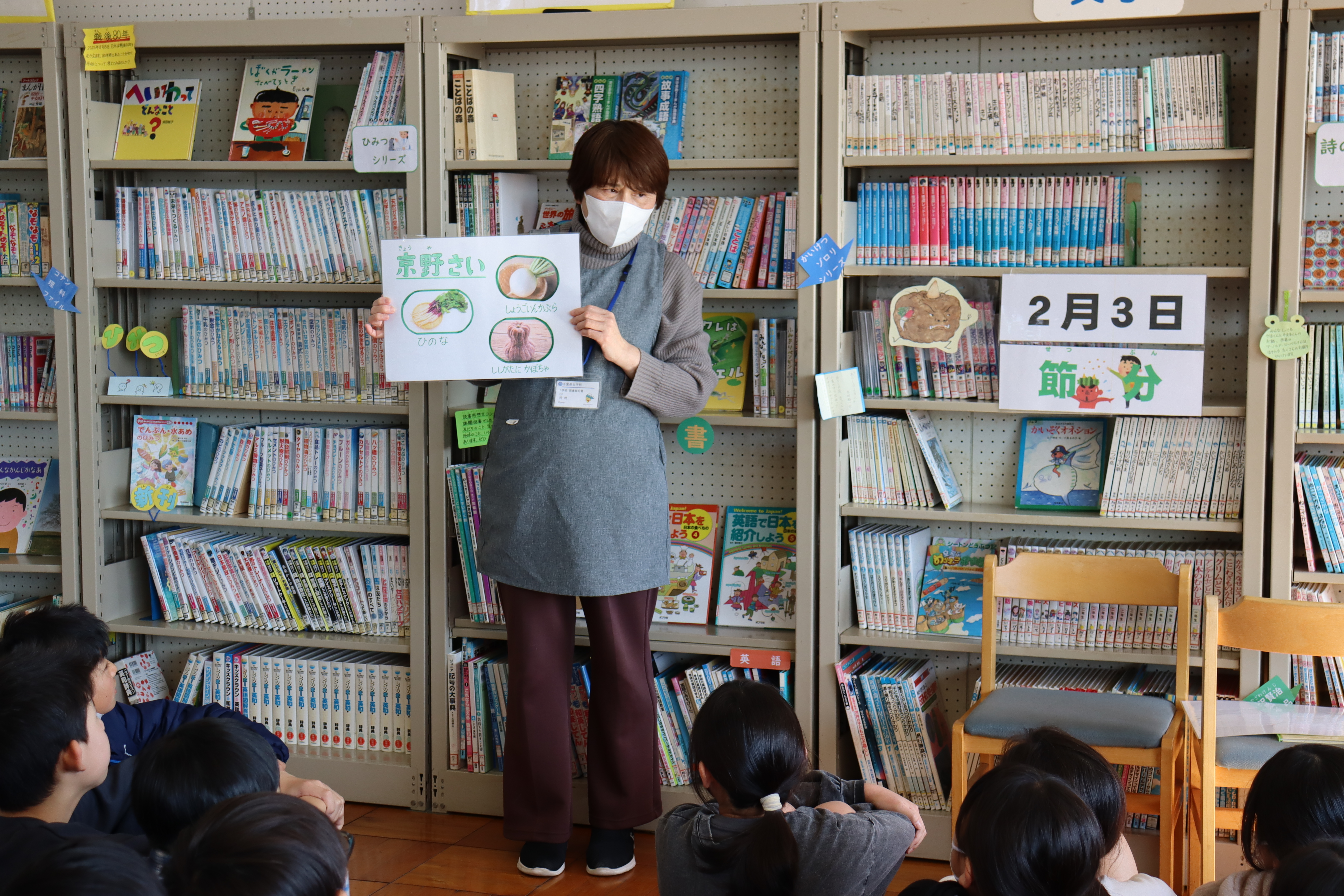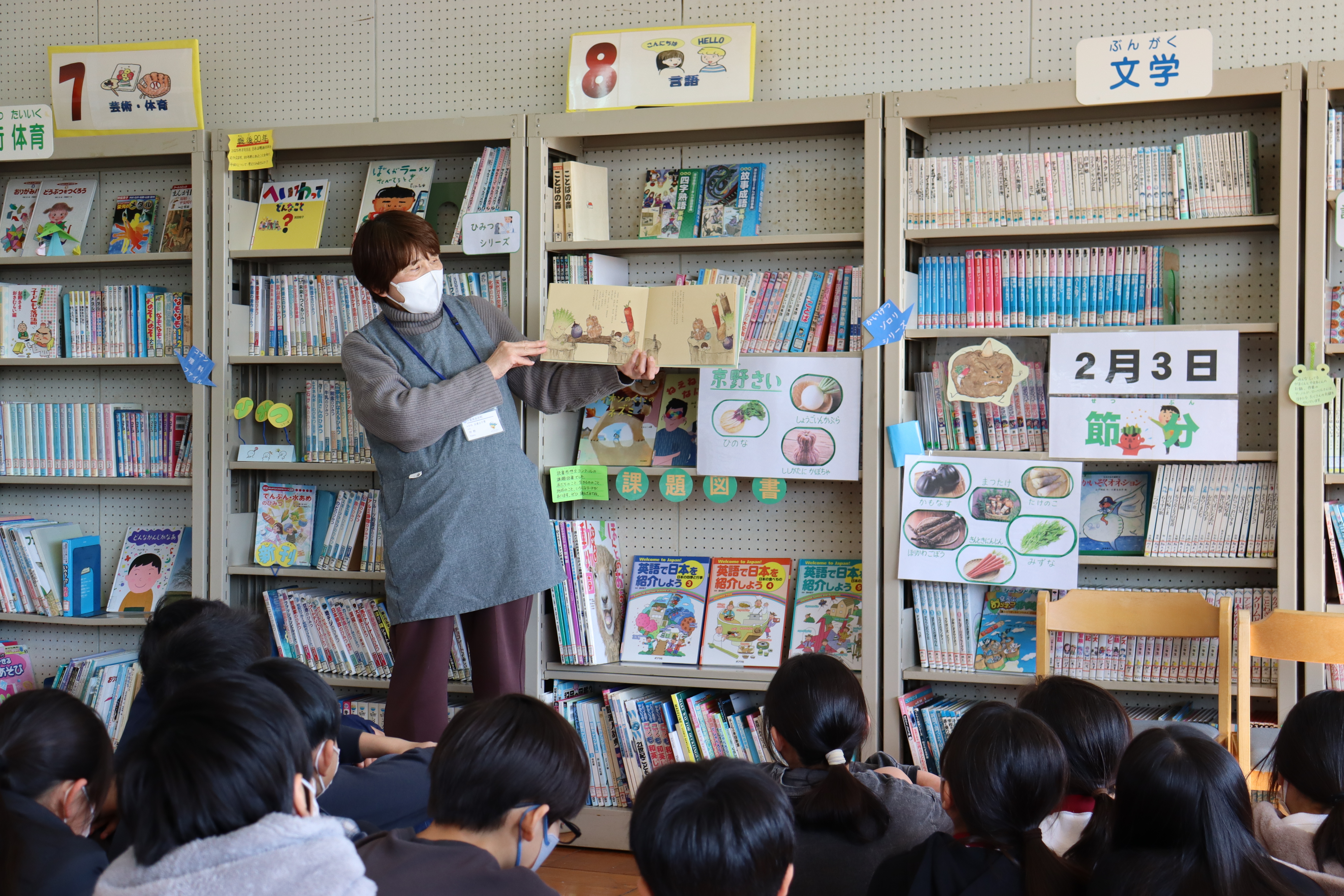 2回目の読み聞かせ会が行われました。会場となった図書室には4~6年生が大勢集まりました。もうすぐ節分ということで、こんにゃく芋の鬼を京野菜たちが力を合わせて追い出すという内容の絵本を読んでいただきました。