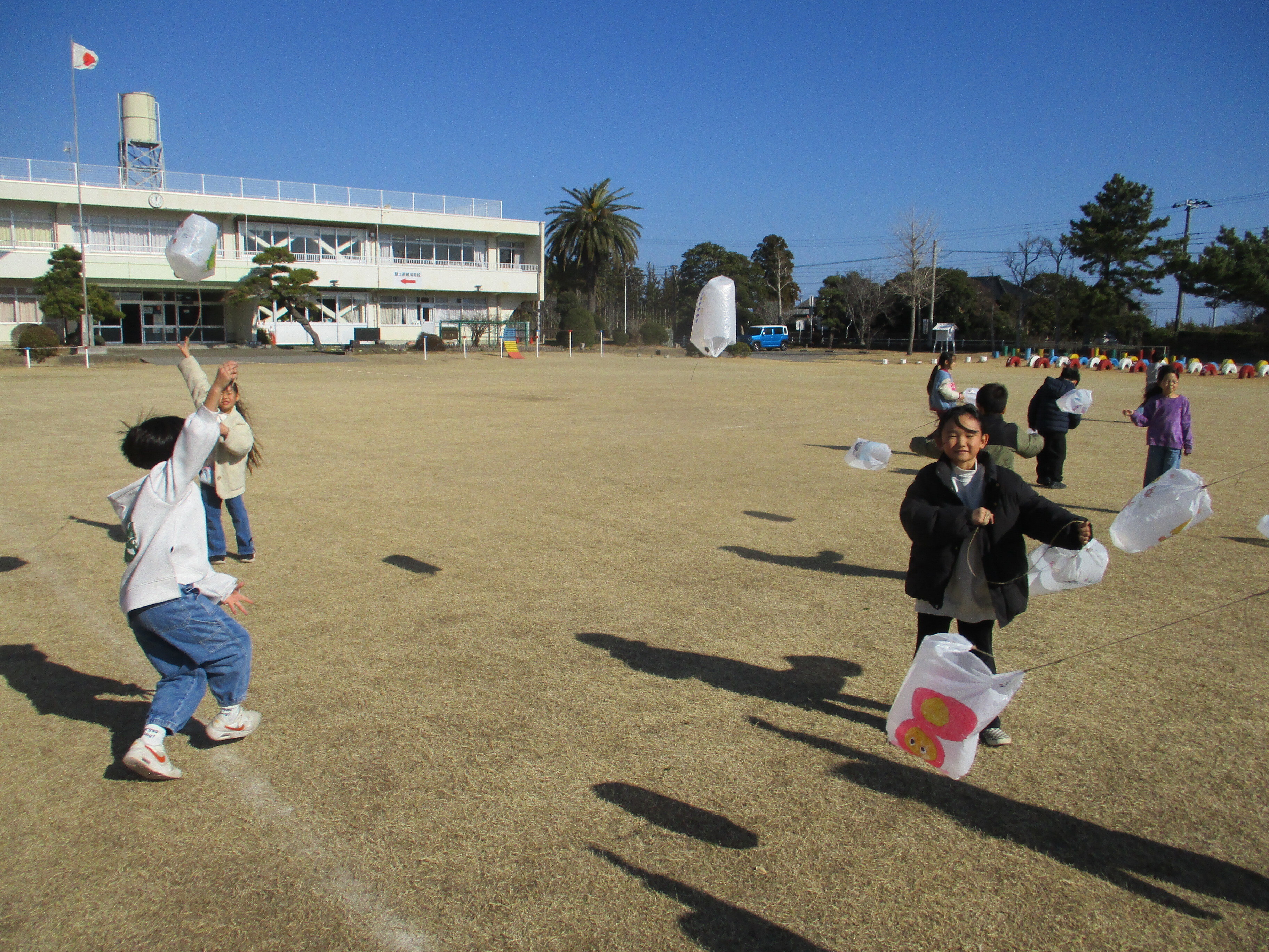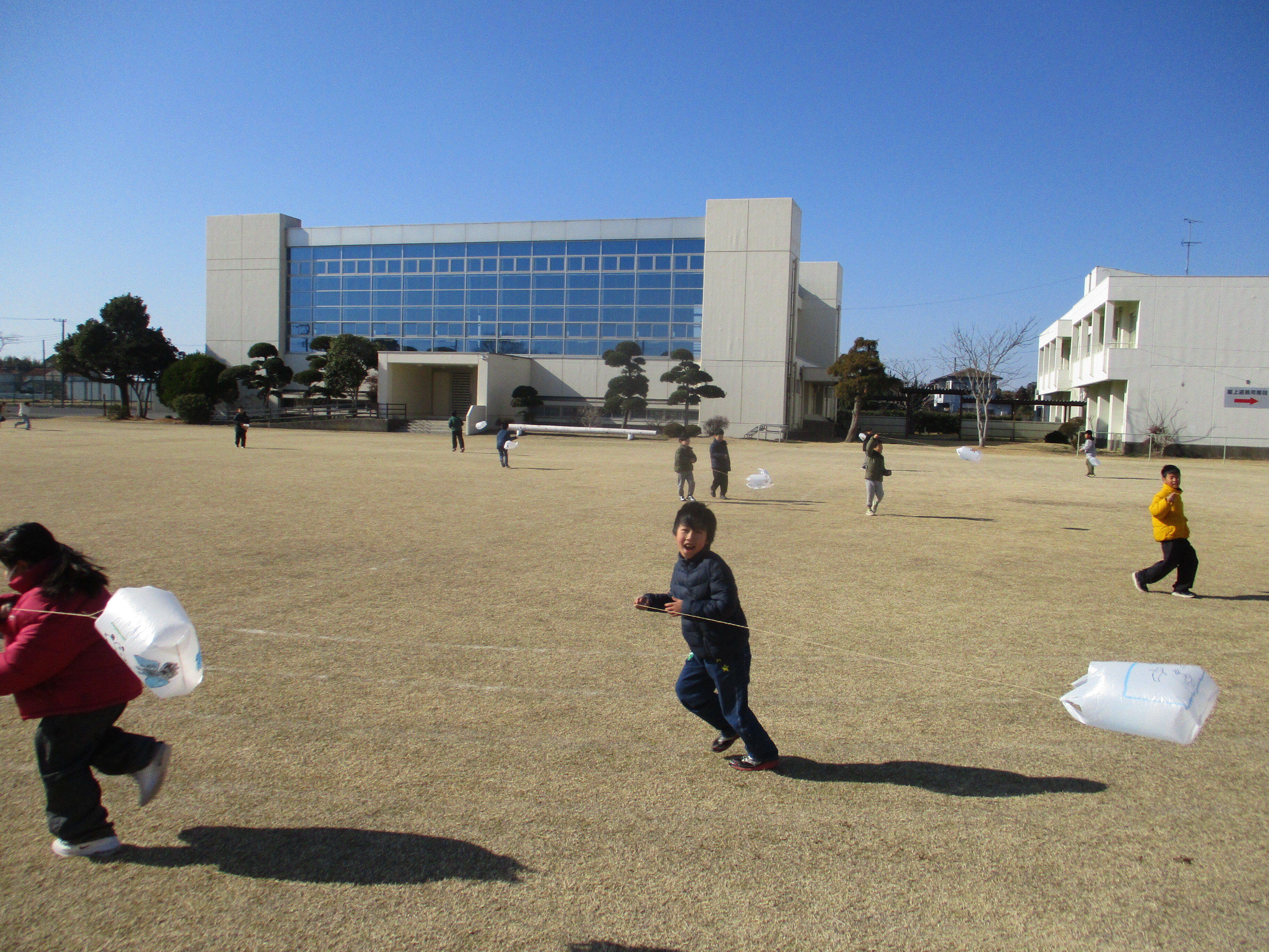 生活科の学習で、ビニール袋を使ってたこを作りました。ひもをぎゅっと結ぶのに苦労しました。風を受けてたこが高くあがるように、みんなでたくさん走って楽しみました。
