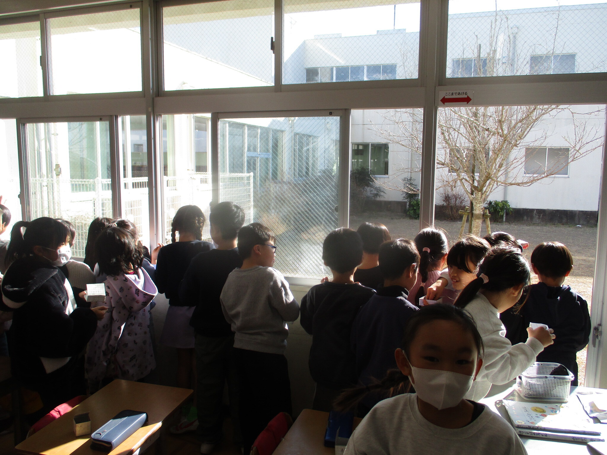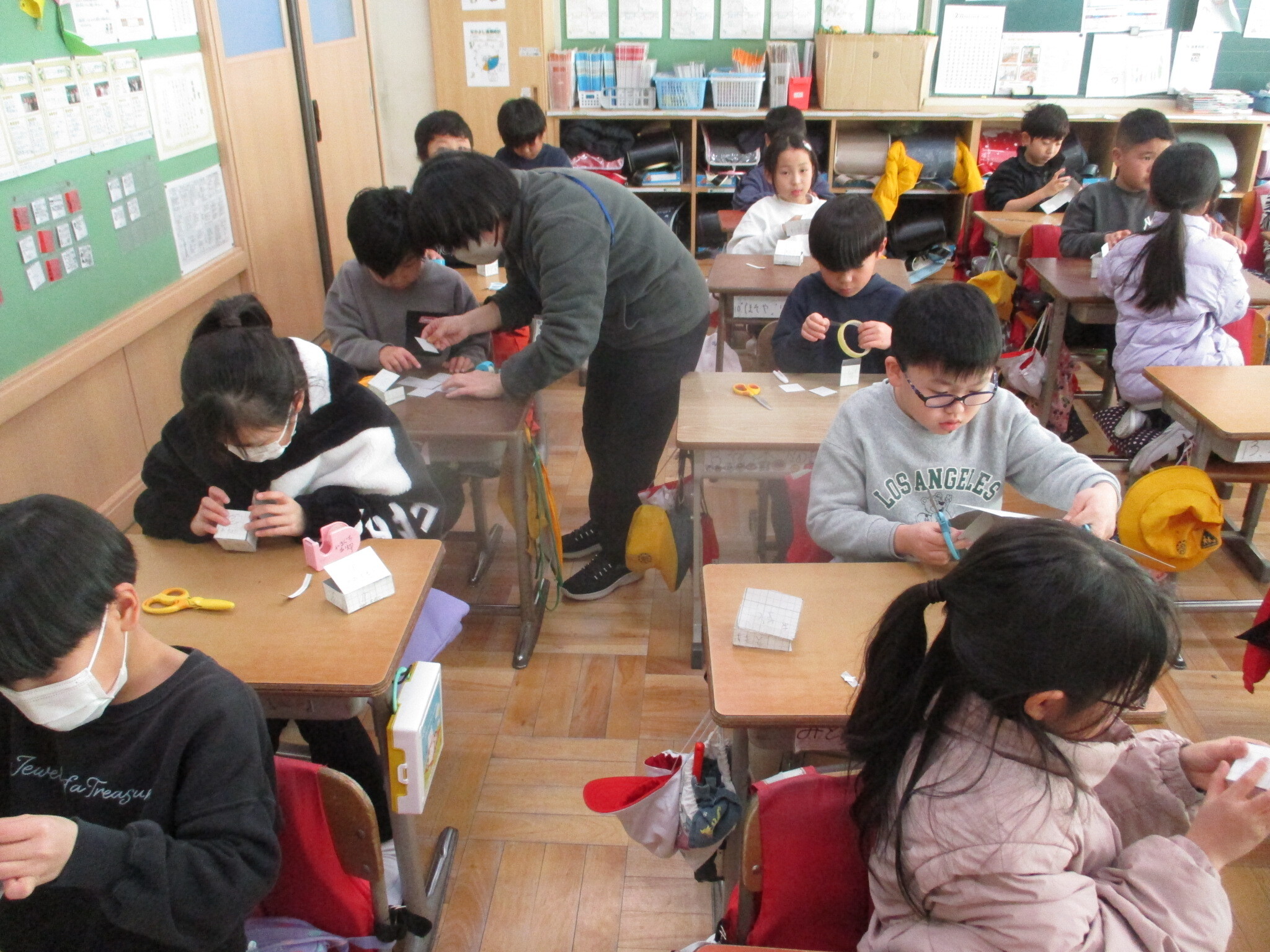 算数科「はこづくり」では、箱に福豆を入れられるよう、それぞれていねいに箱を作ることができました。その後、できた箱に福豆を入れ、元気いっぱいに「鬼は外!福は内!」と豆まきを行いました。これで今年も安心です。