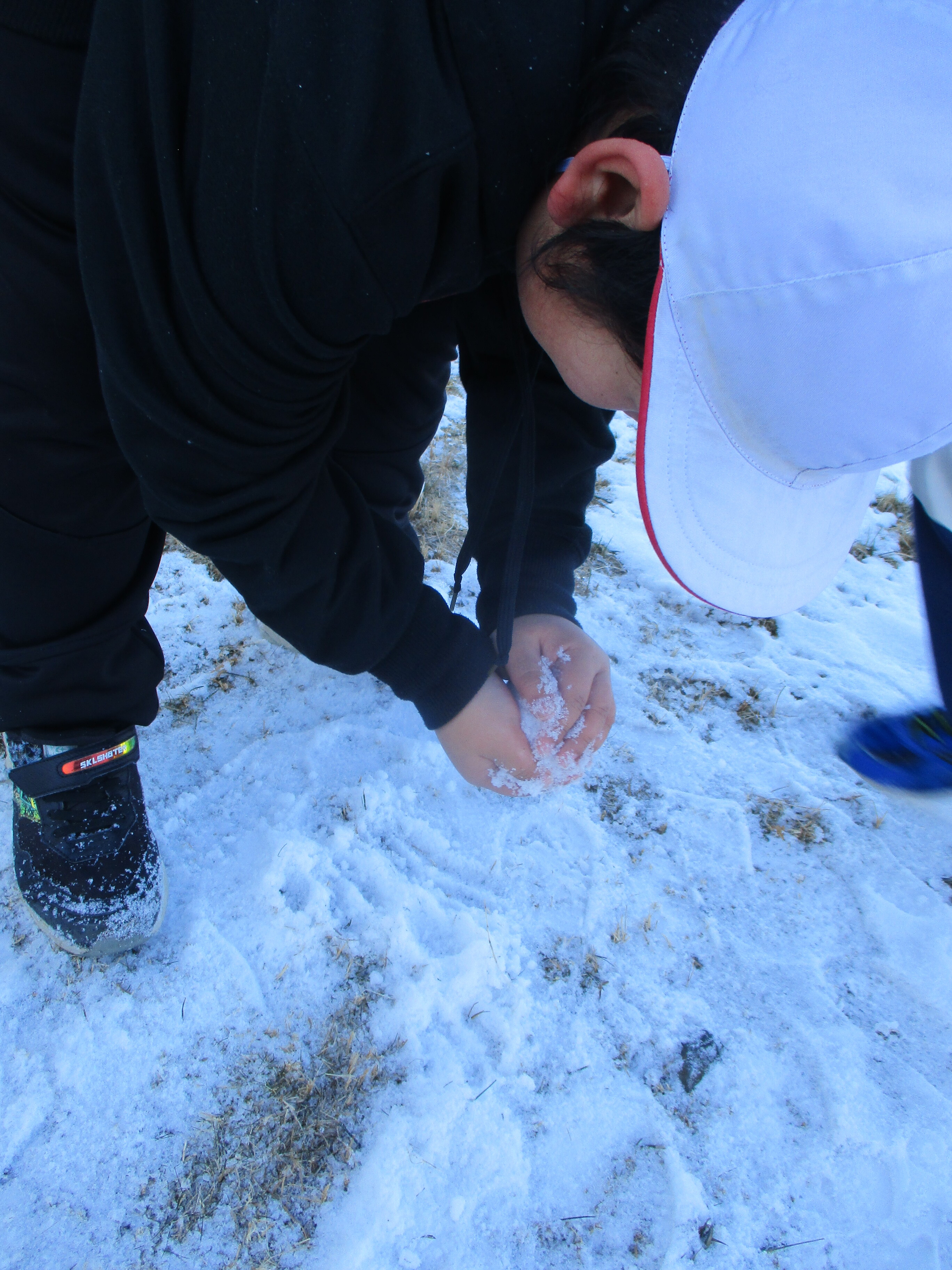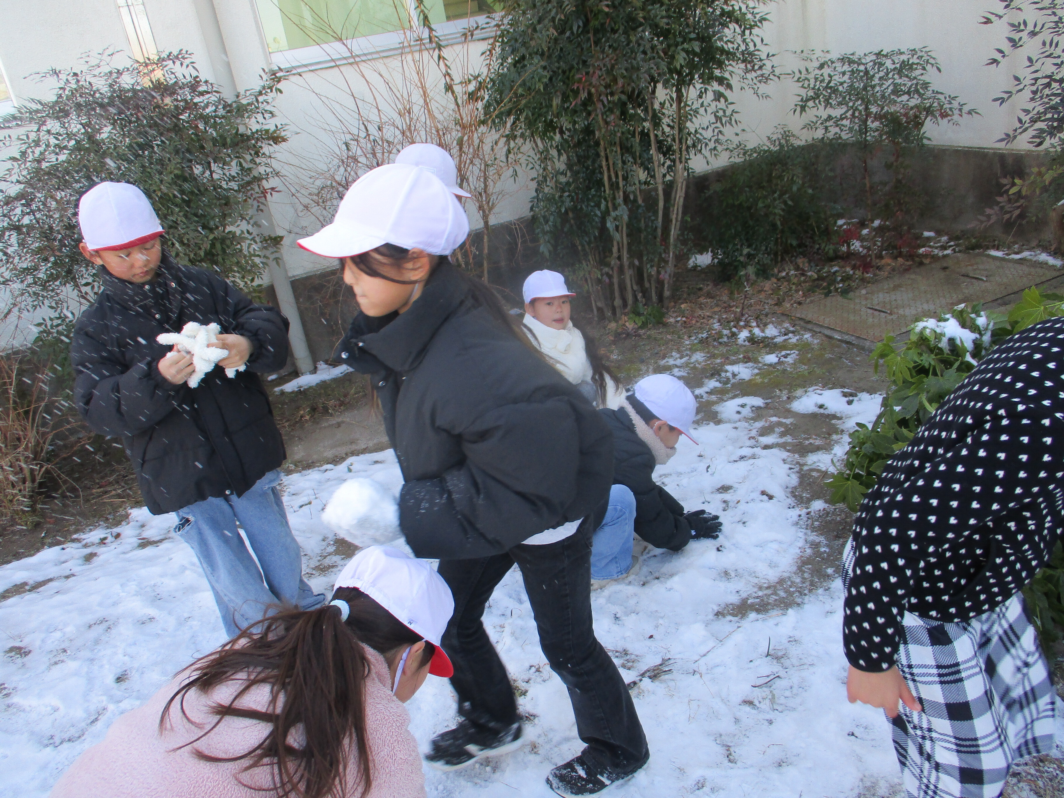 思いのほか積もった雪に、子どもたちはお家でたくさん遊んだことを教えてくれました。しかし、学校の友達と遊ぶことはまた格別だったようです。「手袋だとうまく丸まらない」と冷たいのに手袋をはずし、素手でかわいい雪だるまを作っていました。