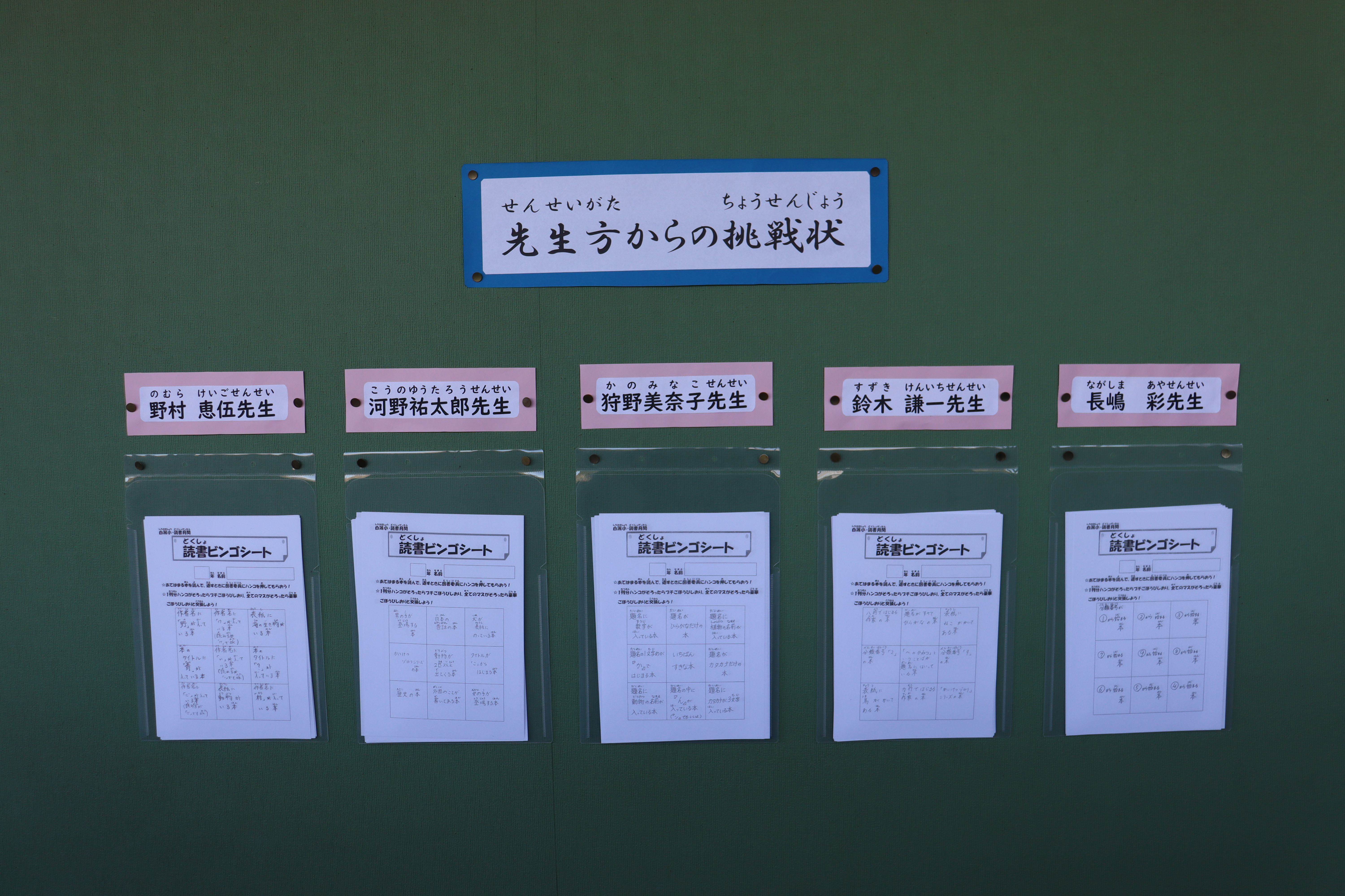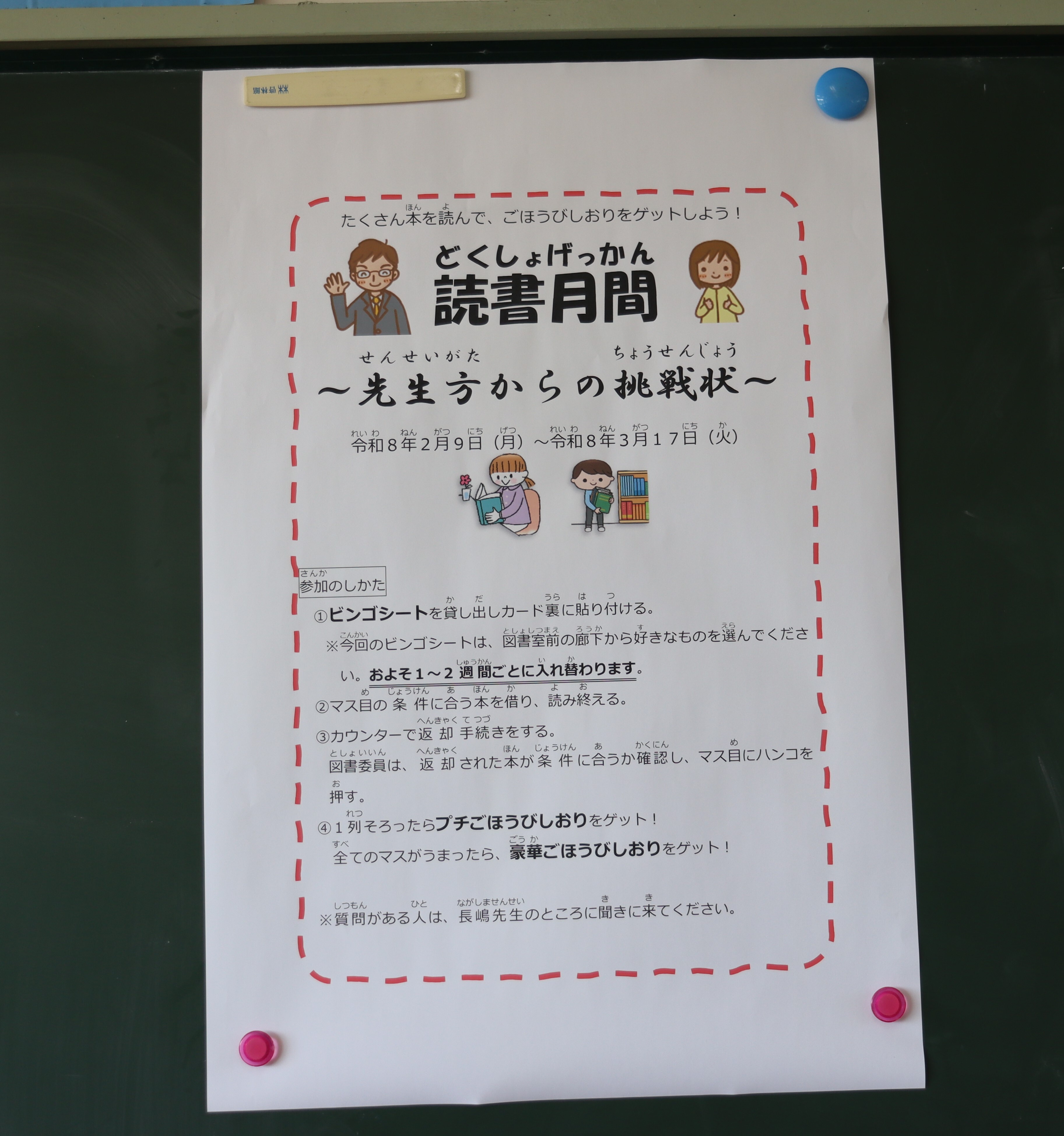 本日より、読書月間第2弾として、「ビンゴ 先生方からの挑戦状」が始まりました。期間は3月17日(火)までです。先生方が作った「読書ビンゴ」から好きなものをとり、お題に合う本を読んでビンゴのますをうめていきます。今回も楽しそうです。