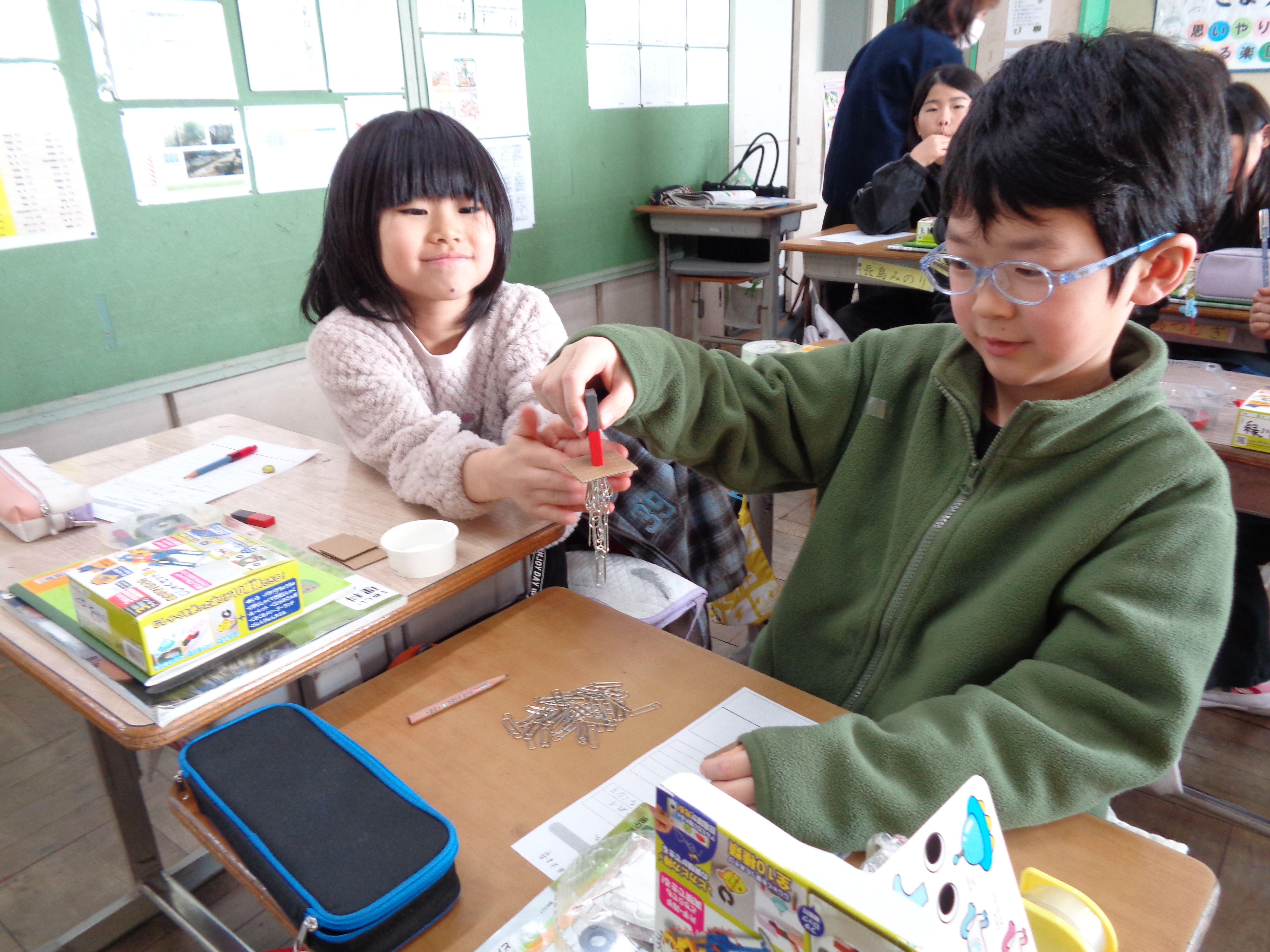 「じしゃくのせいしつ」の学習では、クリップと磁石を使った実験を行いました。磁石とクリップの間に段ボールを入れ、段ボールの枚数を増やすと、引き付けるクリップの数はどのようになるのかを確かめることができました。子どもたちは、楽しく磁石の力について調べることができました。