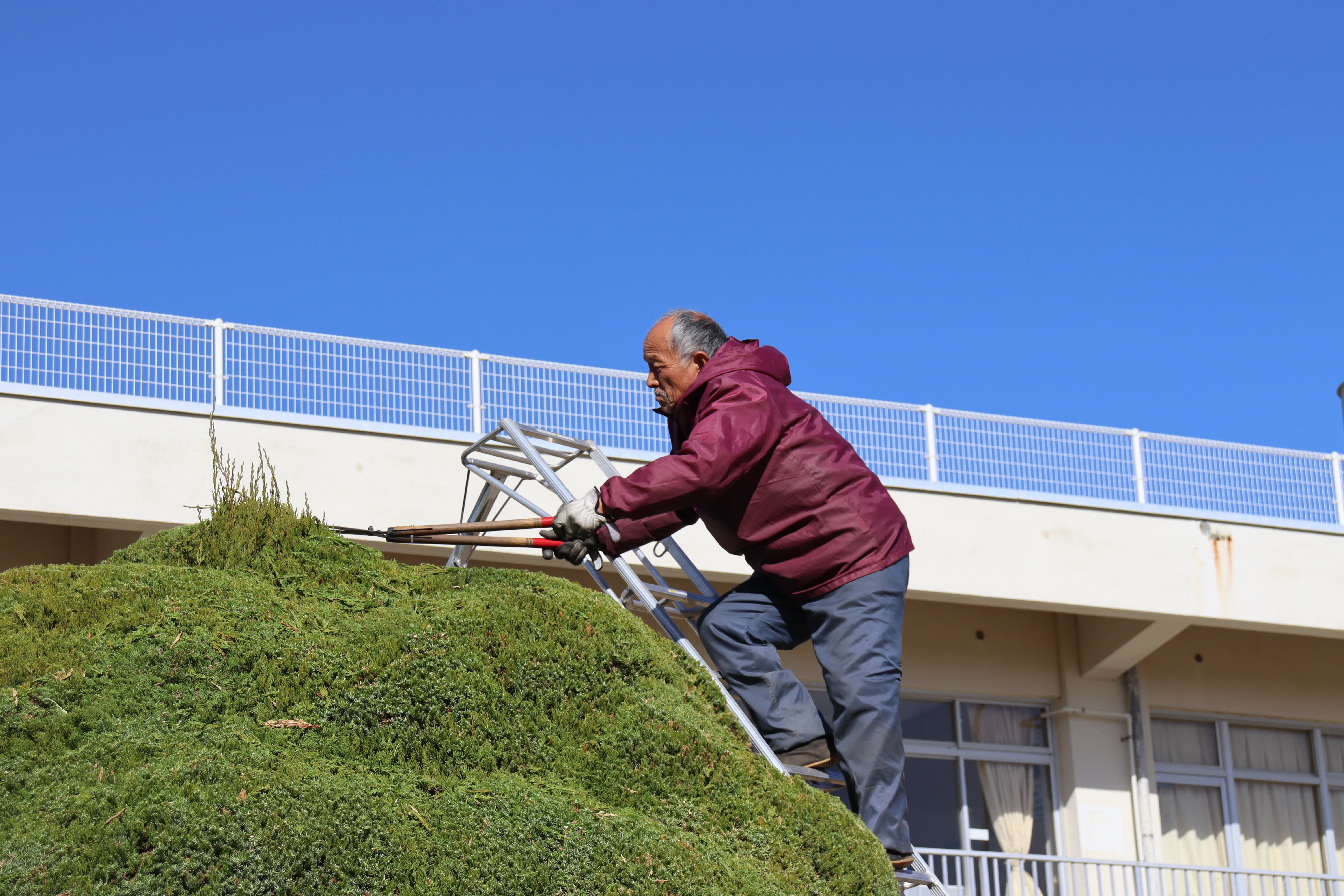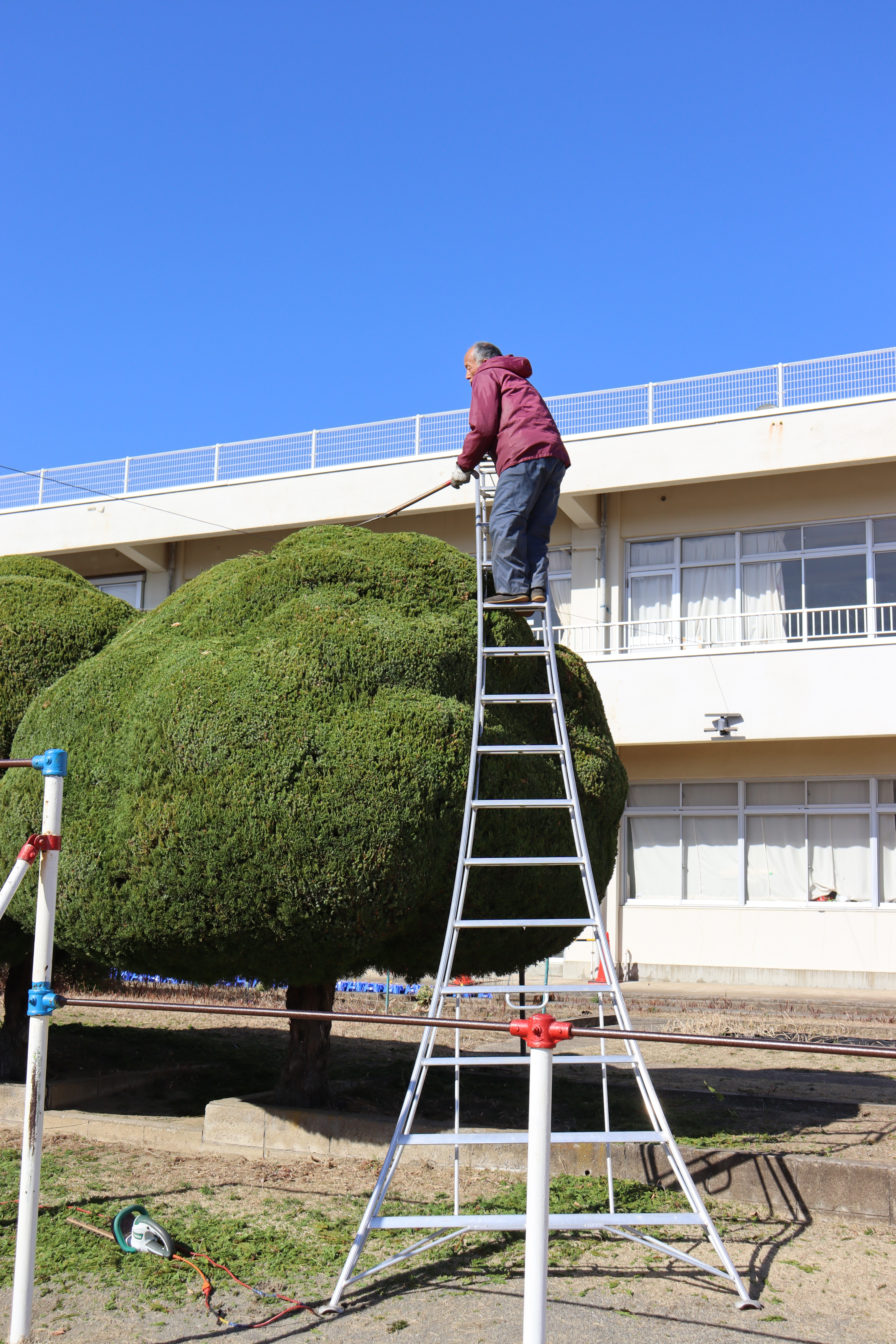学校中の植木を剪定してくださっています。「ここが終わったら次はあっちやりますから」と次から次へと手入れをしてくださっています。こんなに高い脚立に立って、大きい植木ばさみでパチパチ。丸くこんもり、素敵に仕上げていただきました。いつもありがとうございます。
